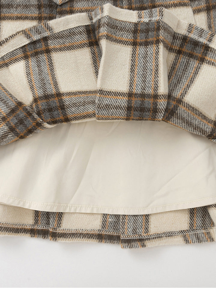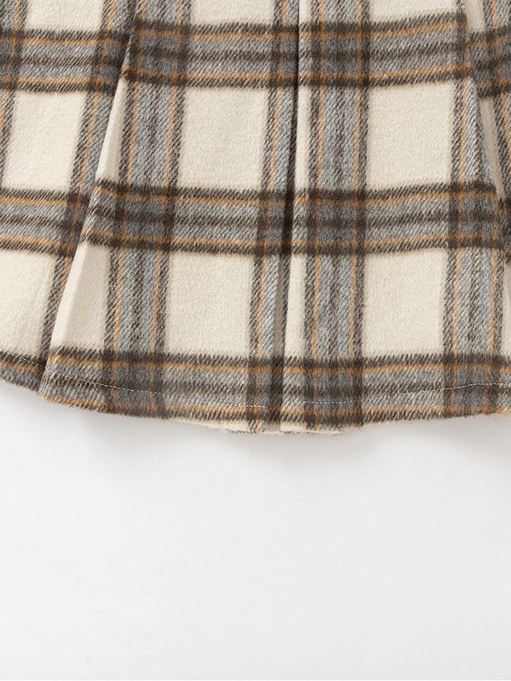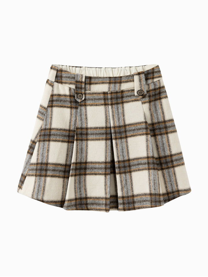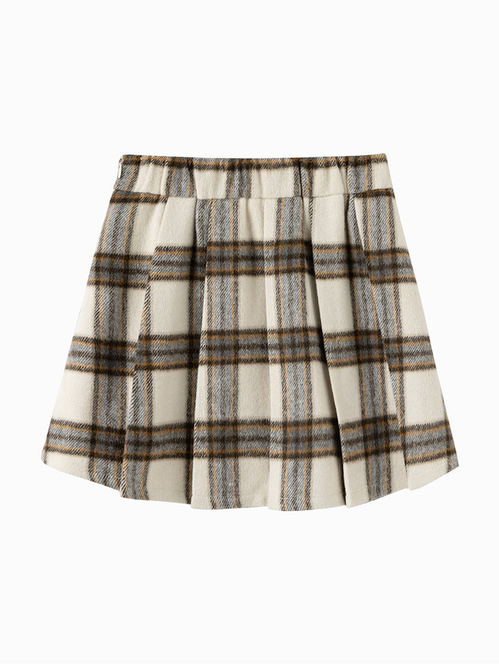 تنورة قصيرة مزينة بنمط طبعة مربعات ملون على كامل التصميم وتفاصيل كسرات، تأتي بسحاب للإغلاق على جانب الخصر