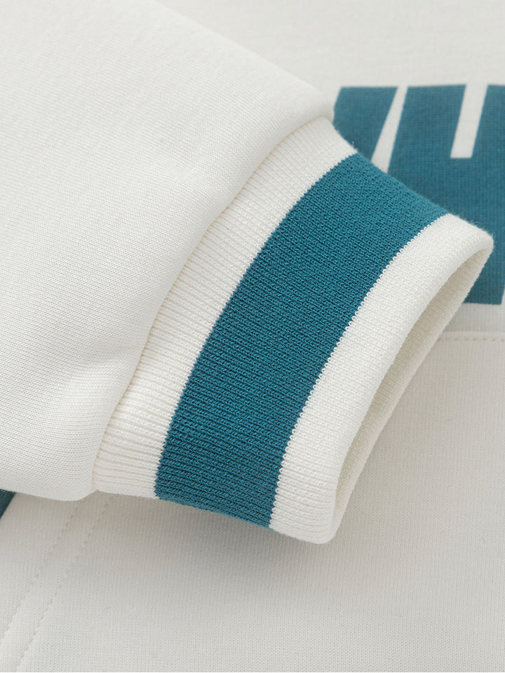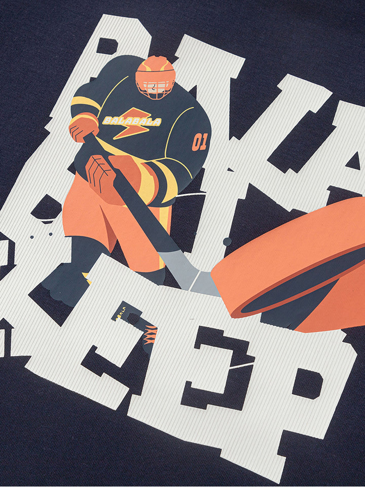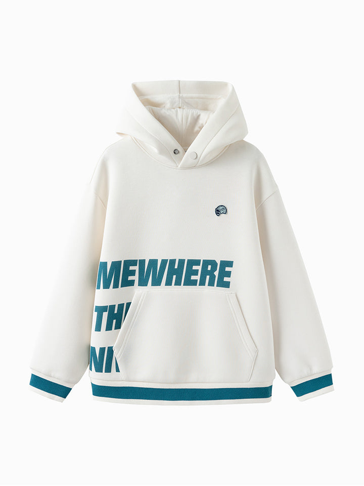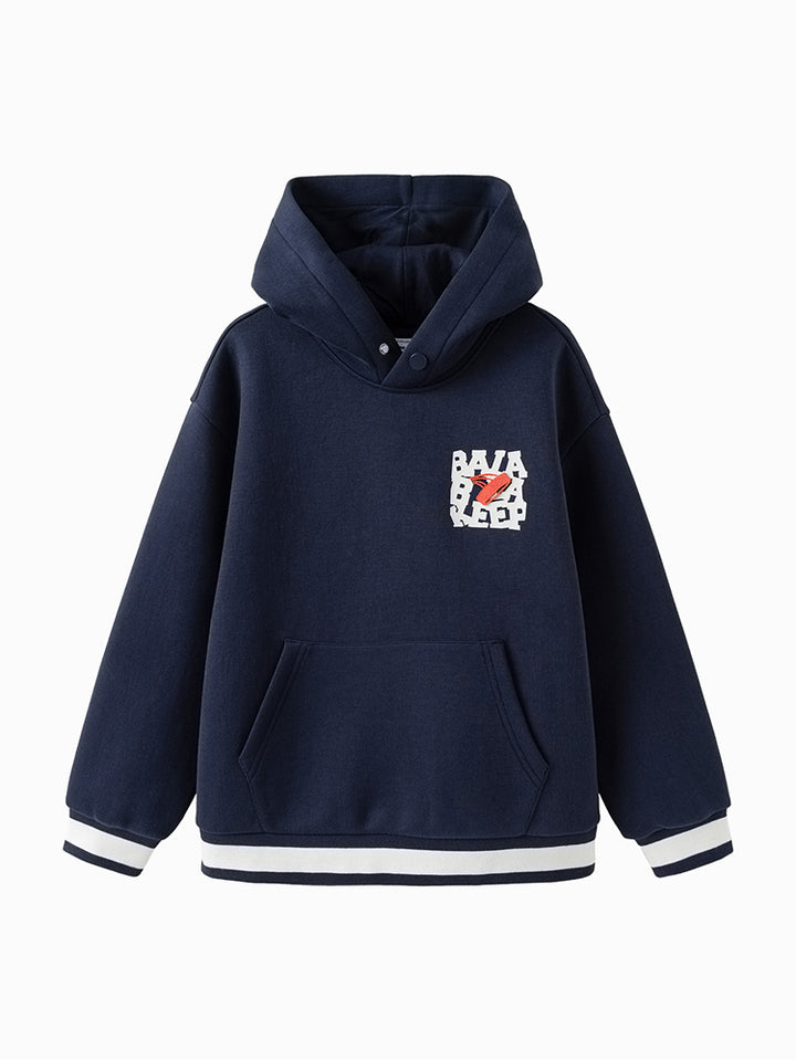 بلوزة هودي كاجوال بأكمام طويلة، مزينة بطبعة متباينة اللون وتطريز صغيرة من الجهة الأمامية، تأتي بجيب أمامي وياقة هودي متصلة