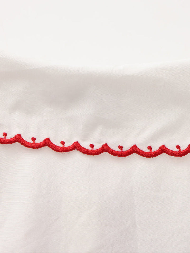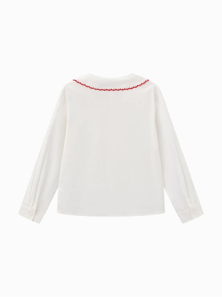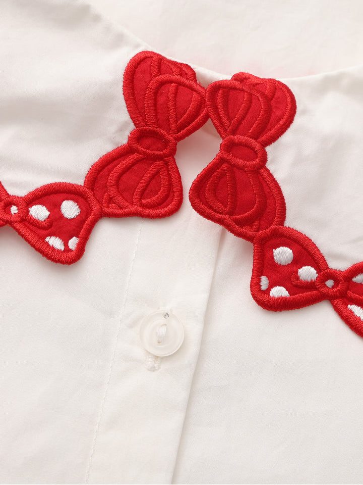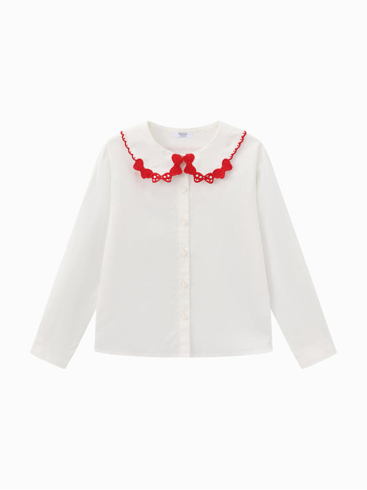 قميص أطفال بأكمام طويلة بتصميم كلاسيكي مع أزرار أمامية وياقة دائرية مزينة بتطريز على شكل فيونكات. قطعة أنيقة تضيف لمسة مميزة لإطلالات يومية أو مناسبات خاصة.