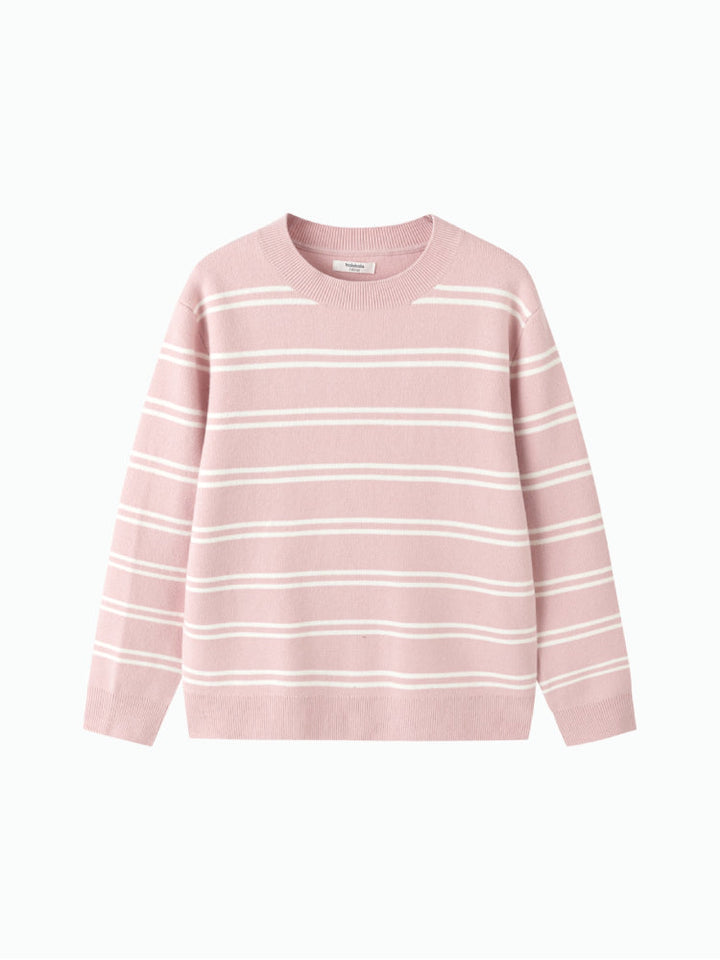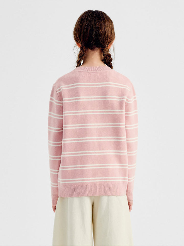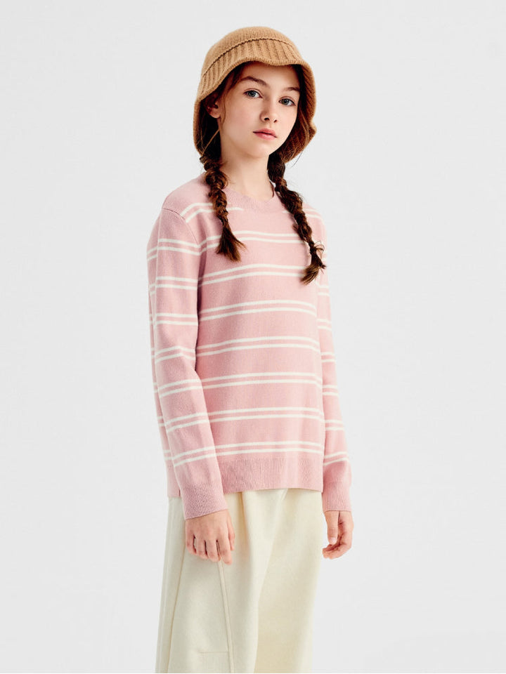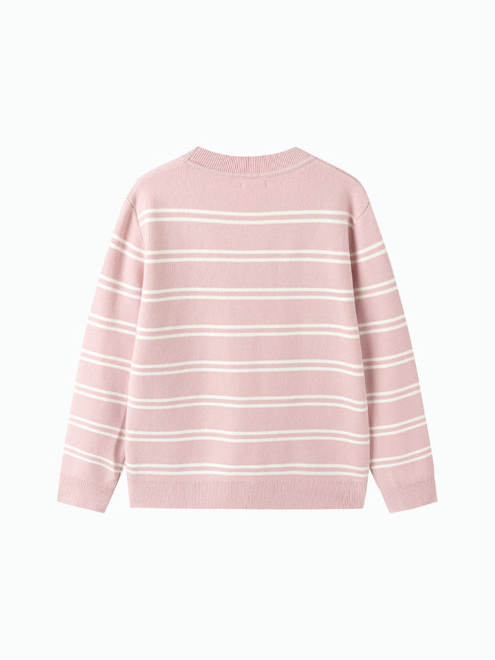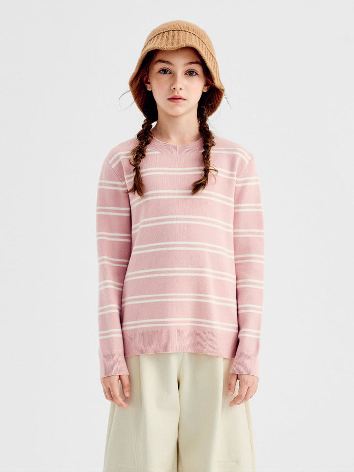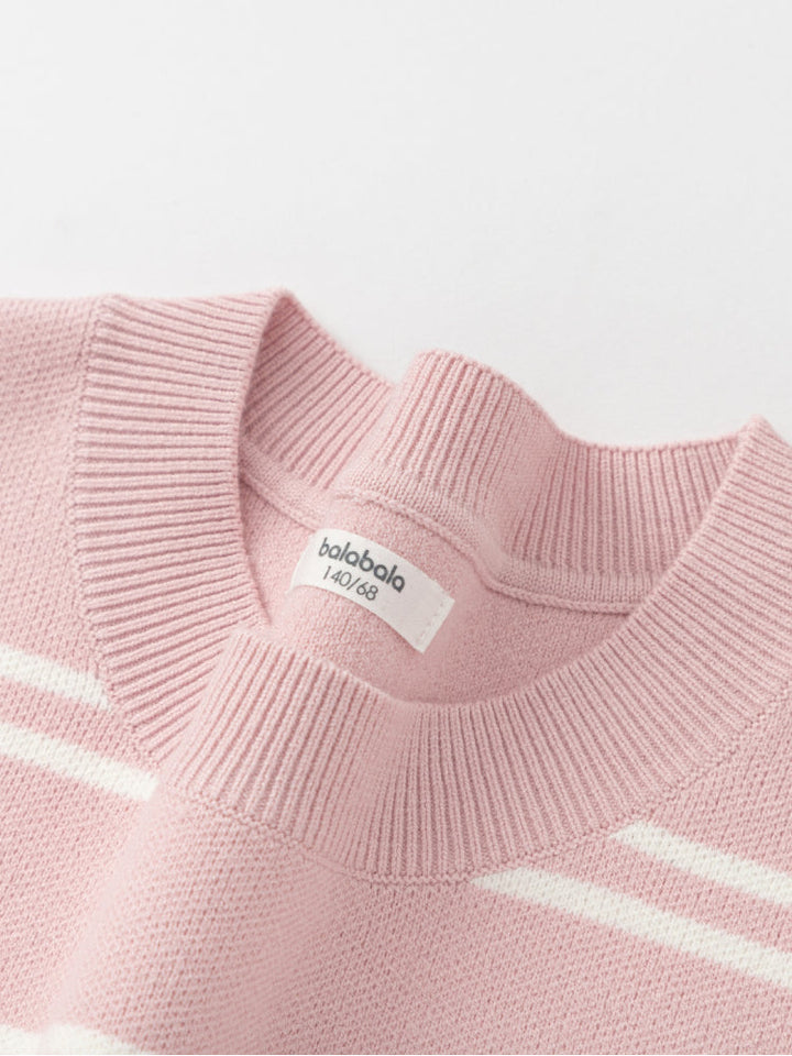 سويتر محبوك للأطفال بتصميم كلاسيكي بخطوط أفقية، مصنوع من قماش محبوك ناعم مع ياقة دائرية وأكمام طويلة ليمنح الراحة والدفء. مثالي للإطلالات اليومية الكاجوال.