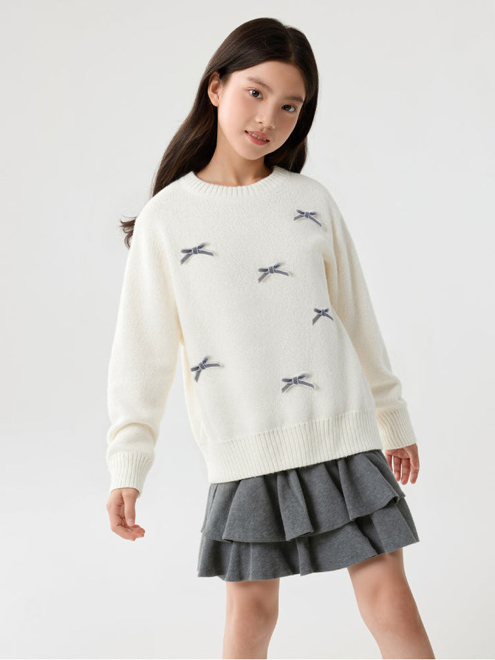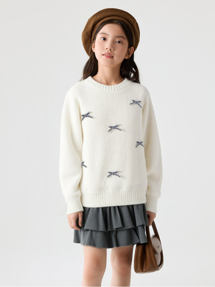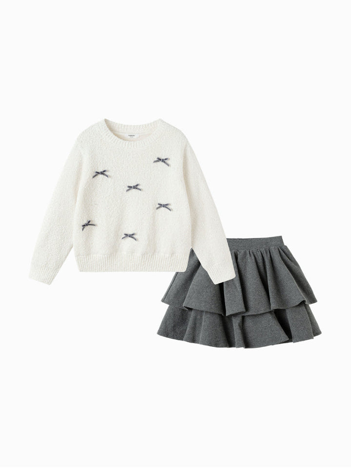 طقم أطفال أنيق مكون من قطعتين، سويتر محبوك مريح مزين بربطات صغيرة، مع تنورة بكشكش متعدد الطبقات. تصميم يجمع بين الراحة والأناقة، مثالي للارتداء اليومي أو المناسبات الخاصة.