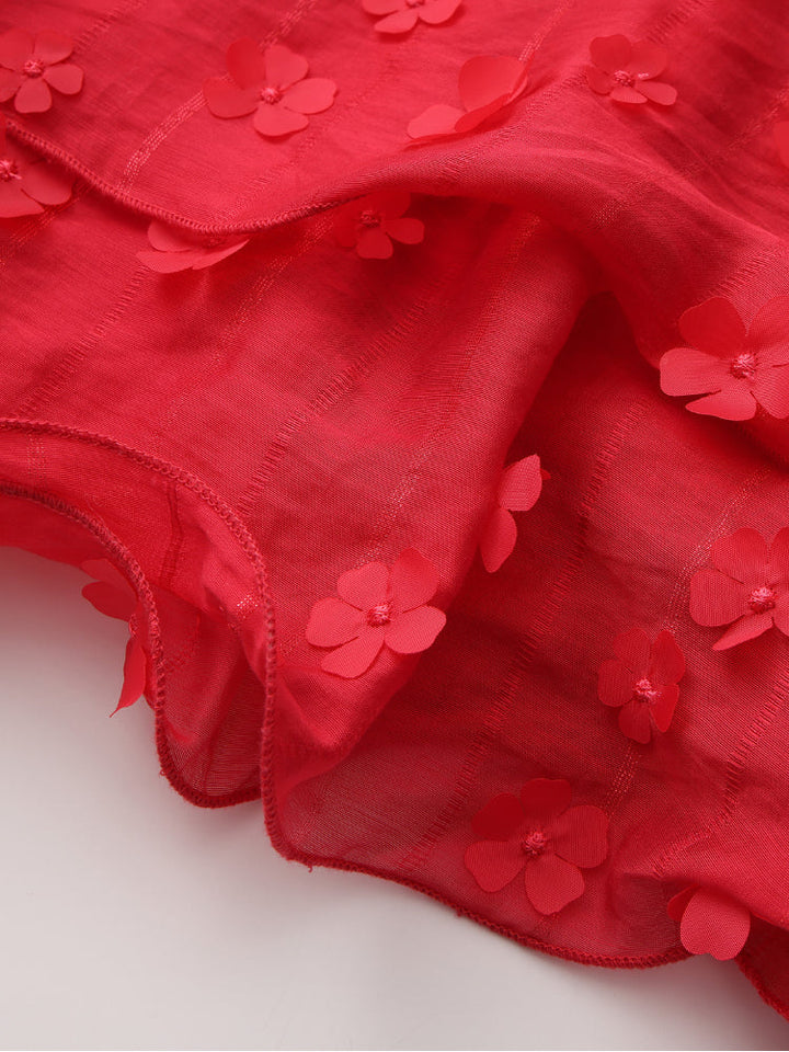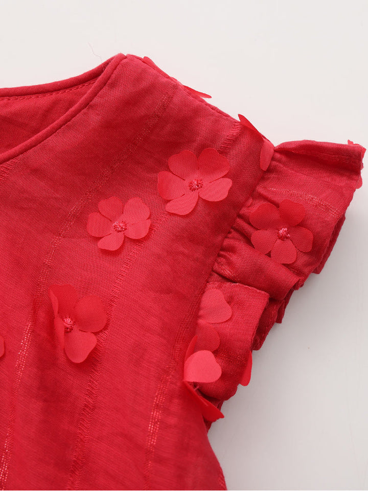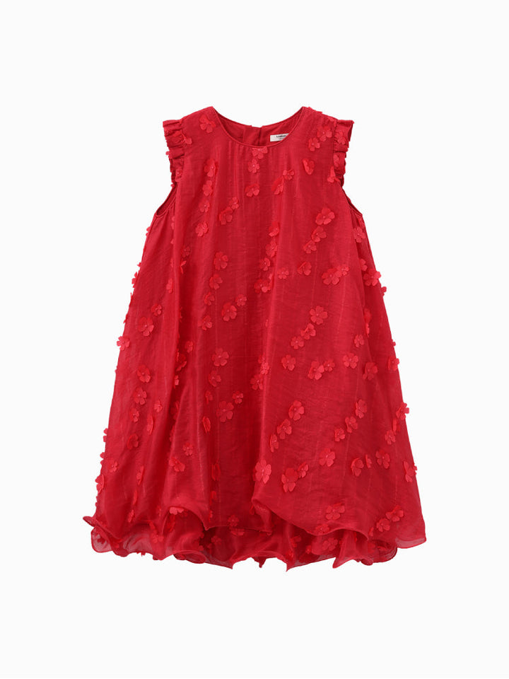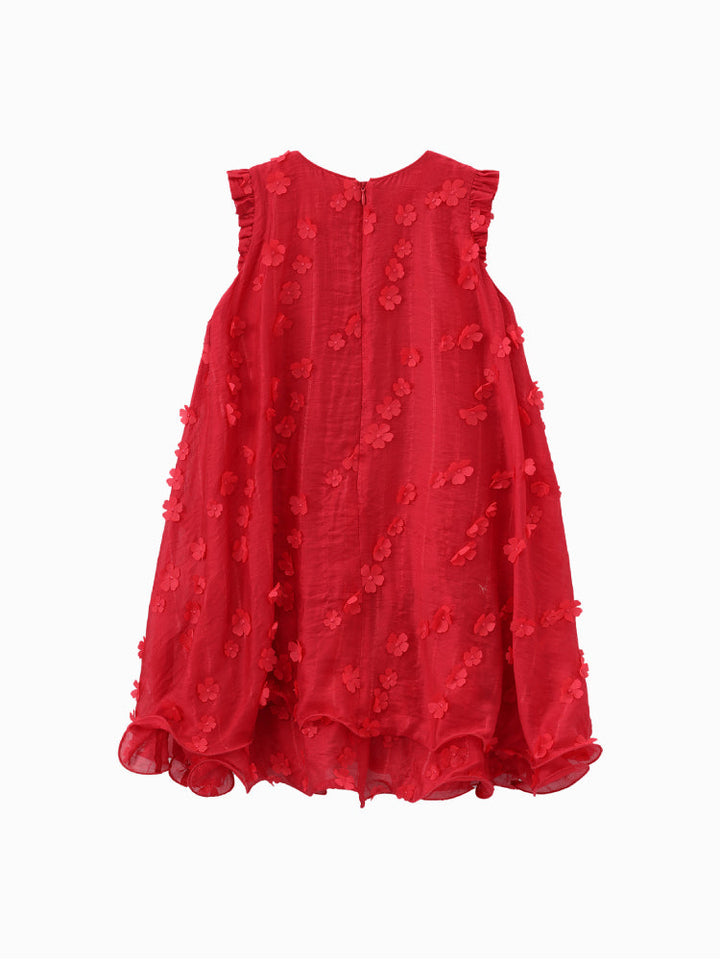 فستان أطفال أنيق بدون أكمام مزين بتطريز ورود بارز في كامل التصميم مع تفاصيل كشكش رقيقة على الأكتاف. خفيف وانسيابي، مثالي للمناسبات الخاصة أو الإطلالات الاحتفالية.