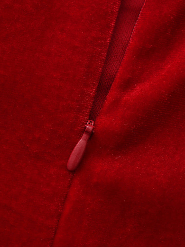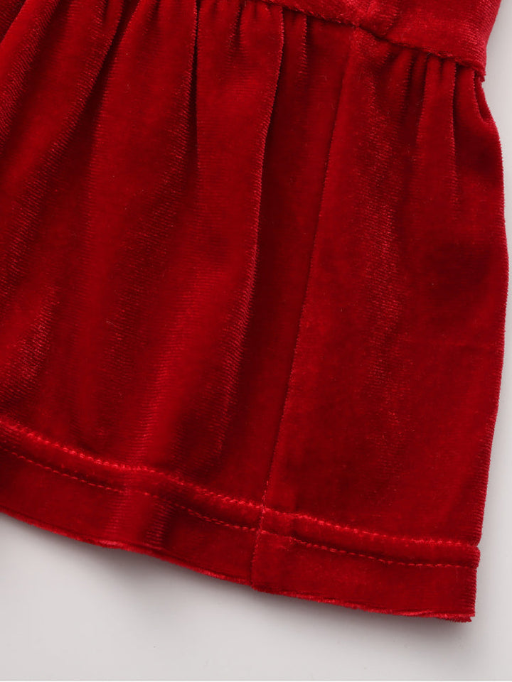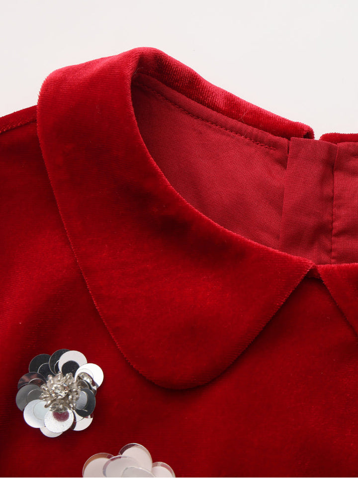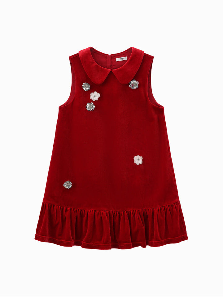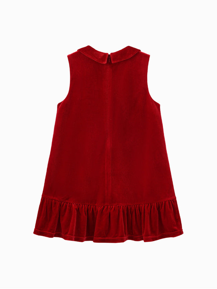 فستان مخملي أنيق بدون أكمام، يتميز بياقة بطرز بيتر بان كلاسيكية وزخارف ورود جميلة في الأمام. يكتمل التصميم بحافة كشكش مرحة تمنحه لمسة أنثوية ساحرة، مثالي للحفلات والتجمعات العائلية والمناسبات الاحتفالية.