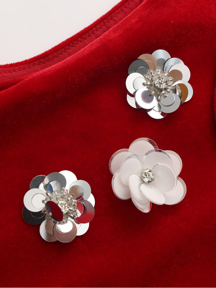 فستان مخملي مزين بزهور وتفاصيل كشكش للبنات