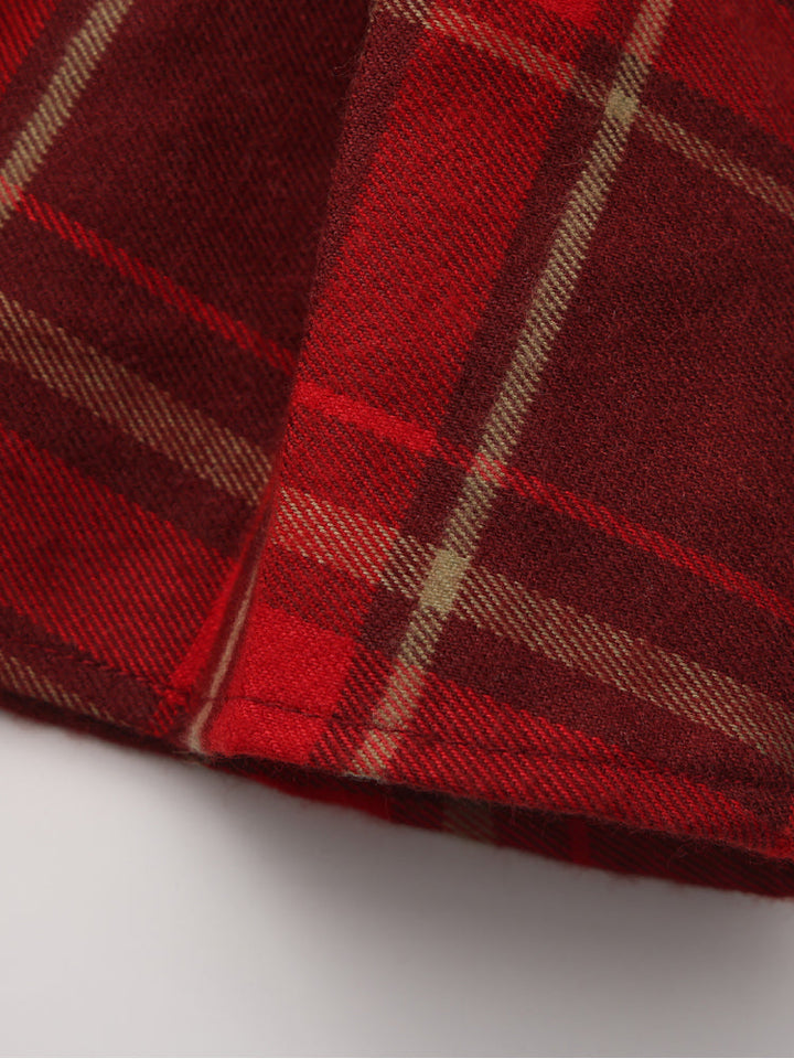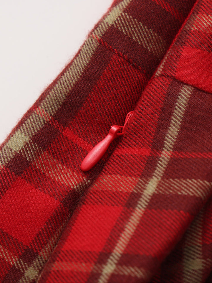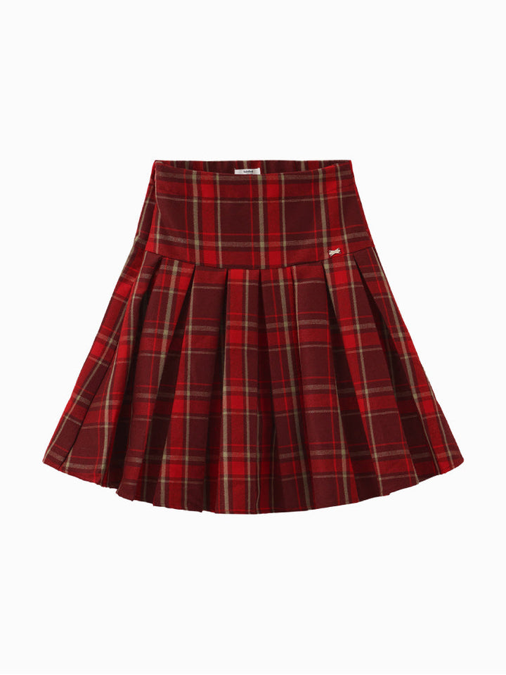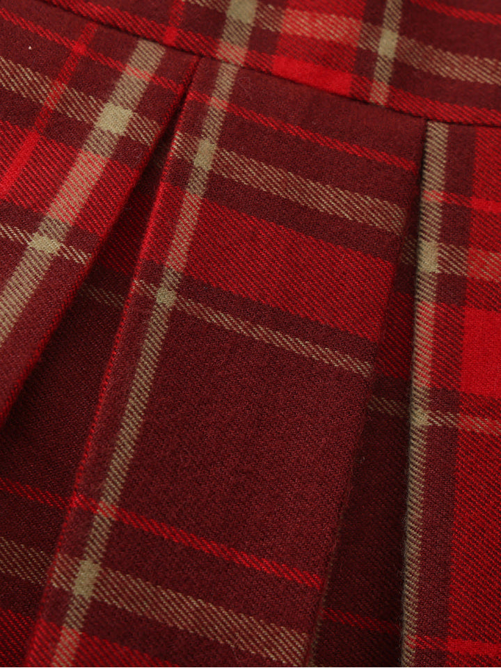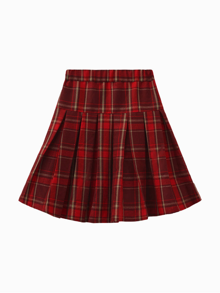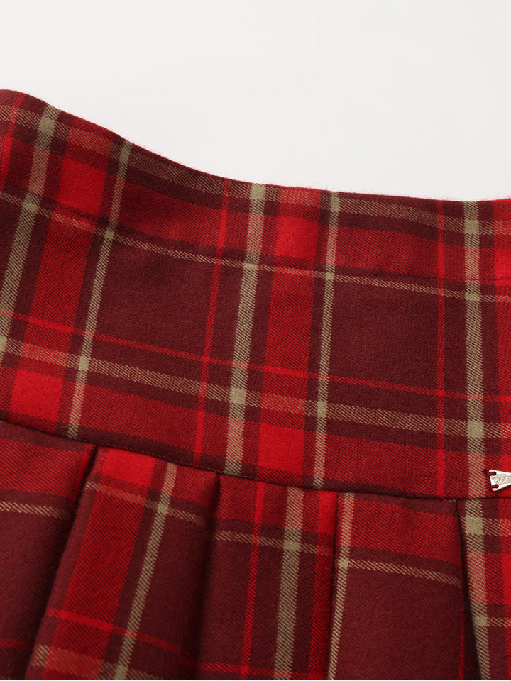 تنورة كلاسيكية مطوية بنقشة مربعات، مزودة بخصر مريح لارتداء سهل. مثالية للتنسيق مع الكنزات أو البلوزات أو الكارديجان لإطلالة أنيقة وعصرية.