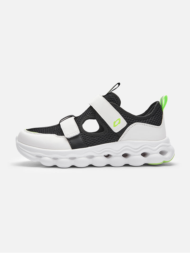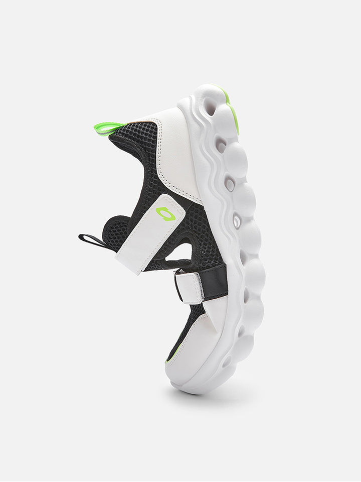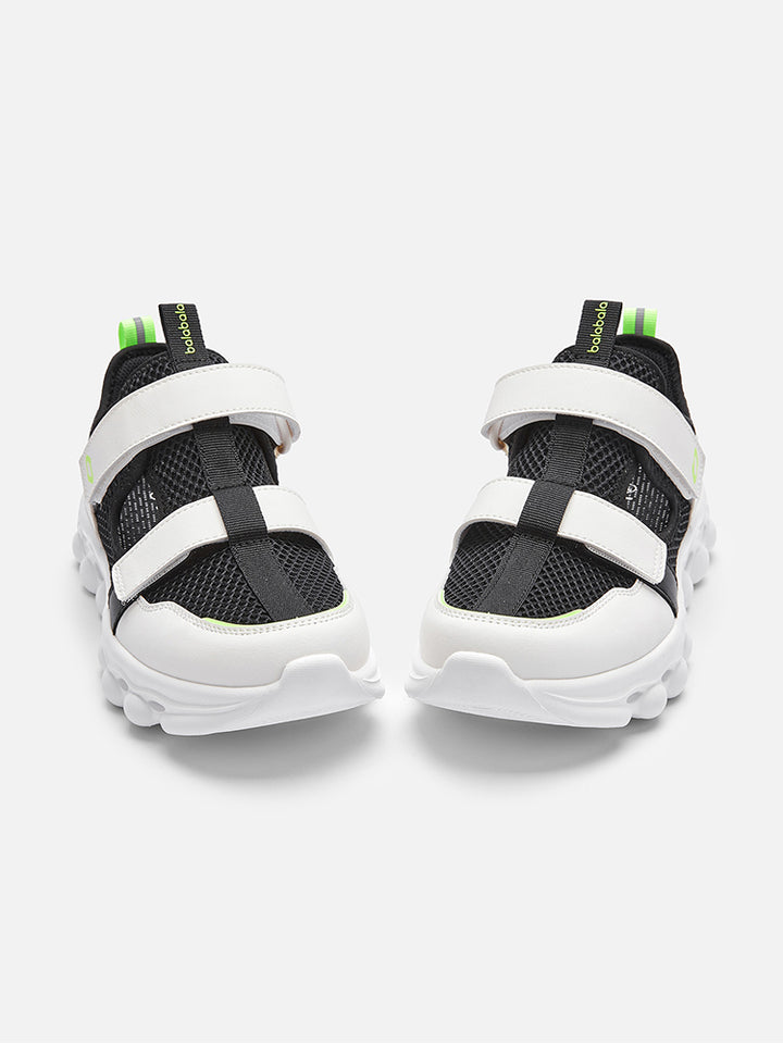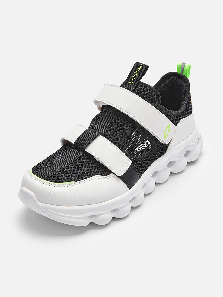 حذاء سنيكرز رياضي مزين بتفاصيل متباينة اللون والخامات، يأتي بشرائط لصق للإغلاق من الجهة العلوية، وبنعل مرن ومريح