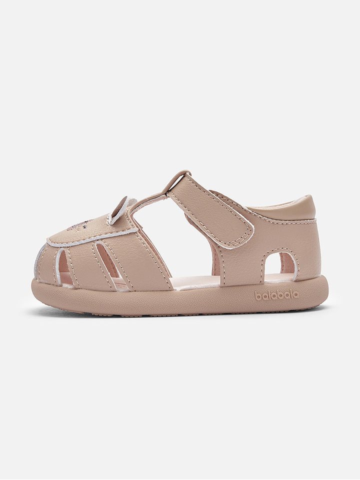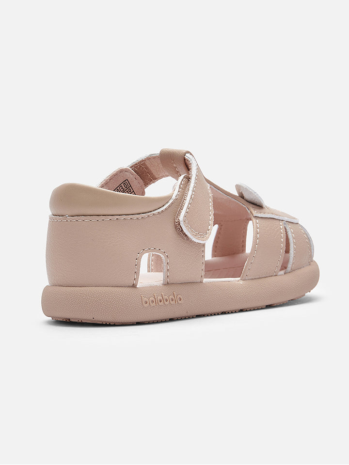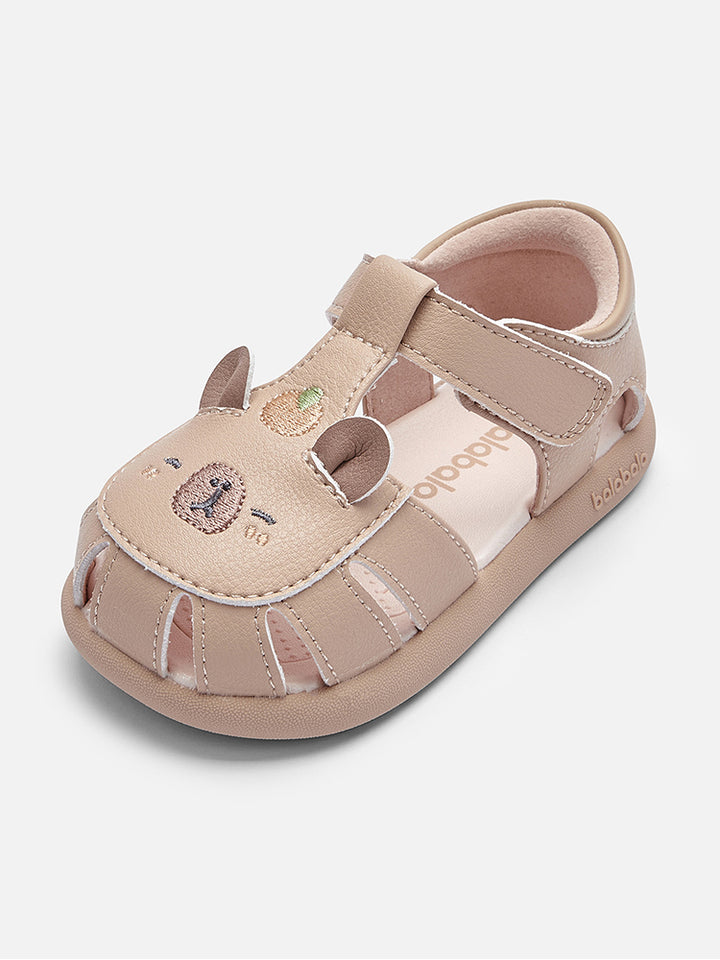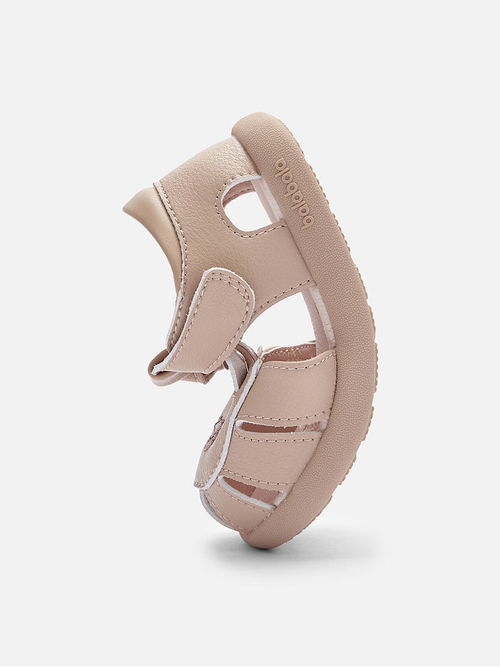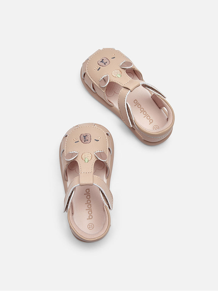 حذاء صندل بنعل مسطح، مزين بتفاصيل تطريز من الجهة الأمامية، يأتي بشريط لصق للإغلاق