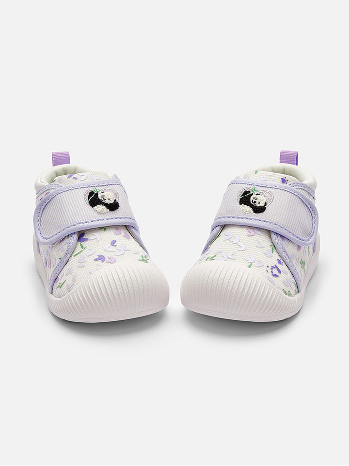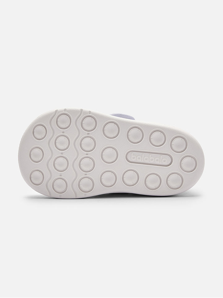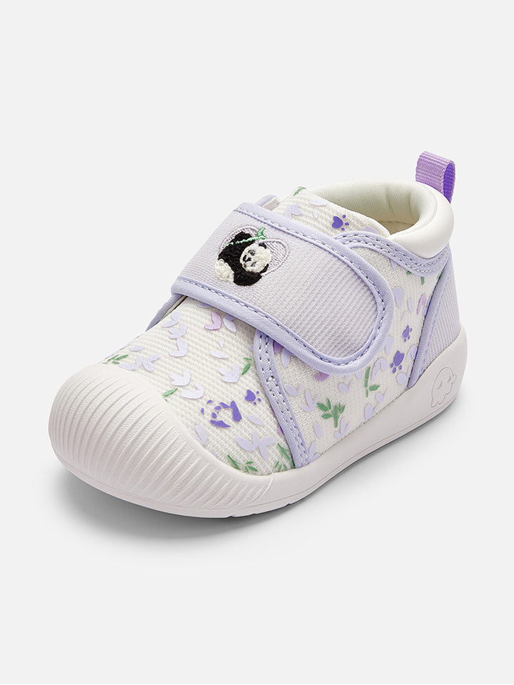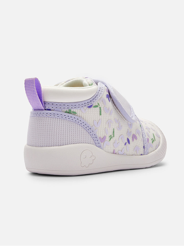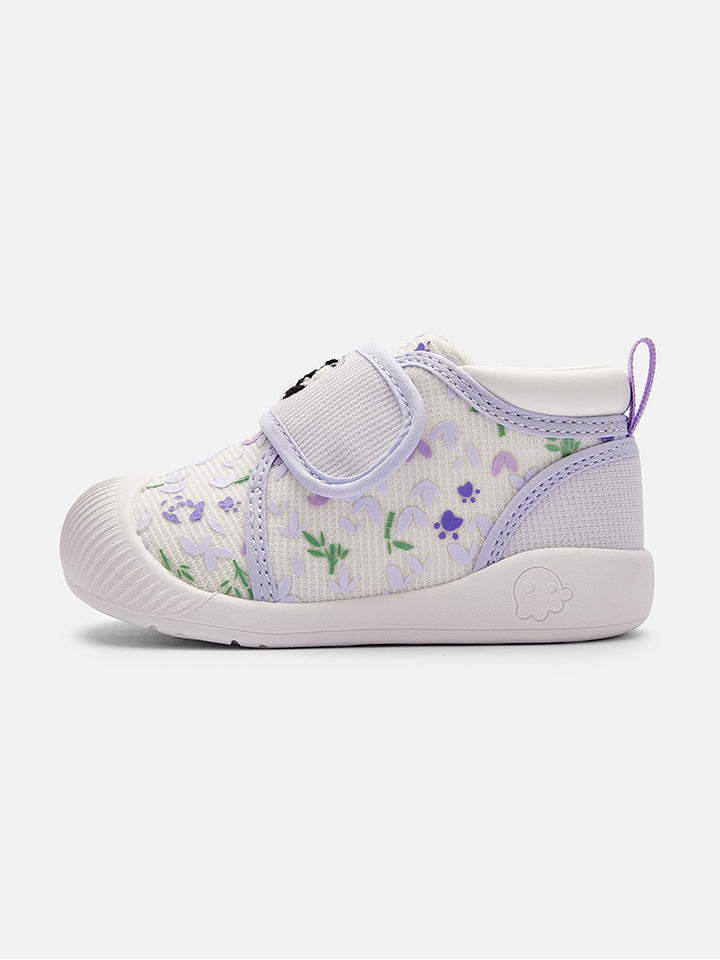 حذاء بيبي مزين بنمط طبعات، يأتي بشريط لصق للإغلاق من الجهة العلوية وبنعل مرن ومريح