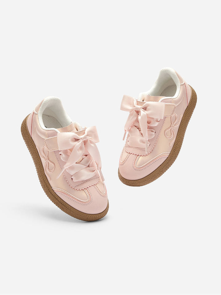 حذاء أنيق للبنات مزين بأربطة على شكل شريط عريض لإطلالة ناعمة وجذابة. يتميز بوسادة داخلية مريحة ونعل متين وتصميم مريح للارتداء طوال اليوم، مثالي للمدرسة أو اللعب أو المناسبات الخاصة.