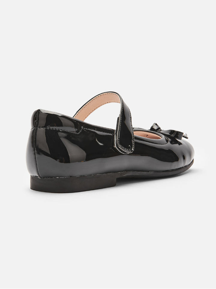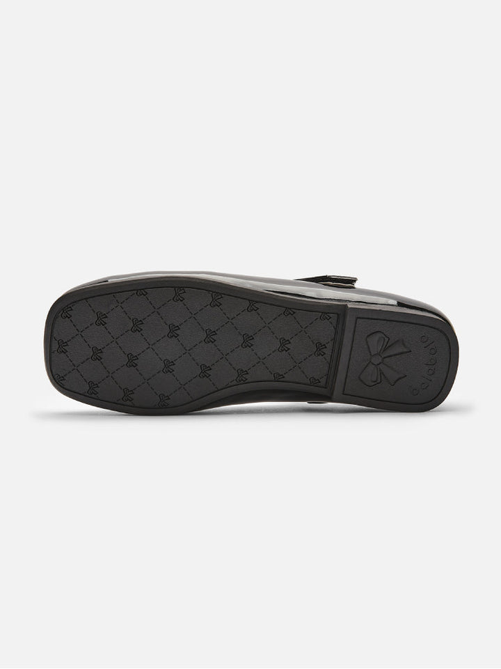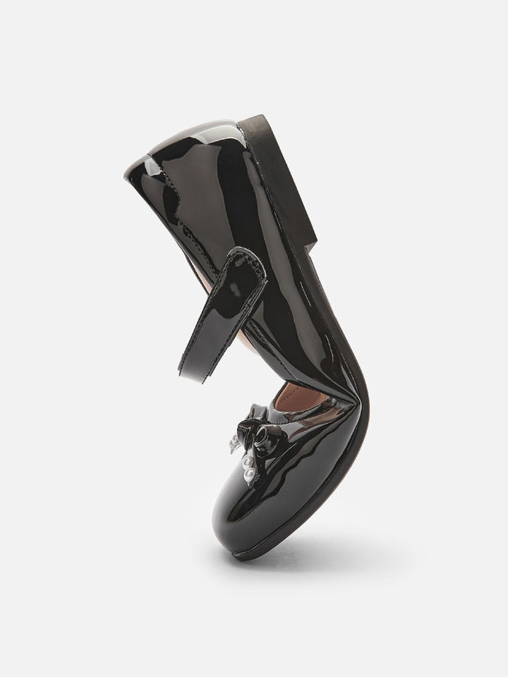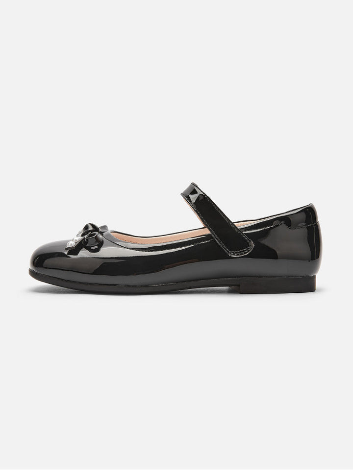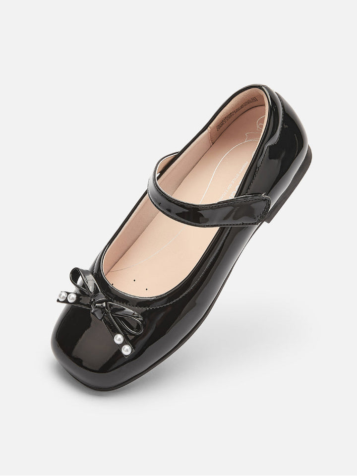 حذاء أنيق للبنات بتصميم مارى جين مصنوع من جلد لامع أسود، مزين بربطة أمامية مع تفاصيل لؤلؤية. يتميز بسير لاصق لسهولة الارتداء ووسادة داخلية مريحة، مثالي للحفلات، المناسبات الخاصة، أو المدرسة.