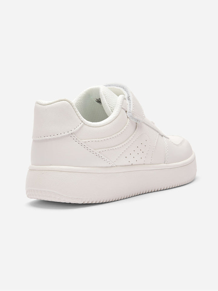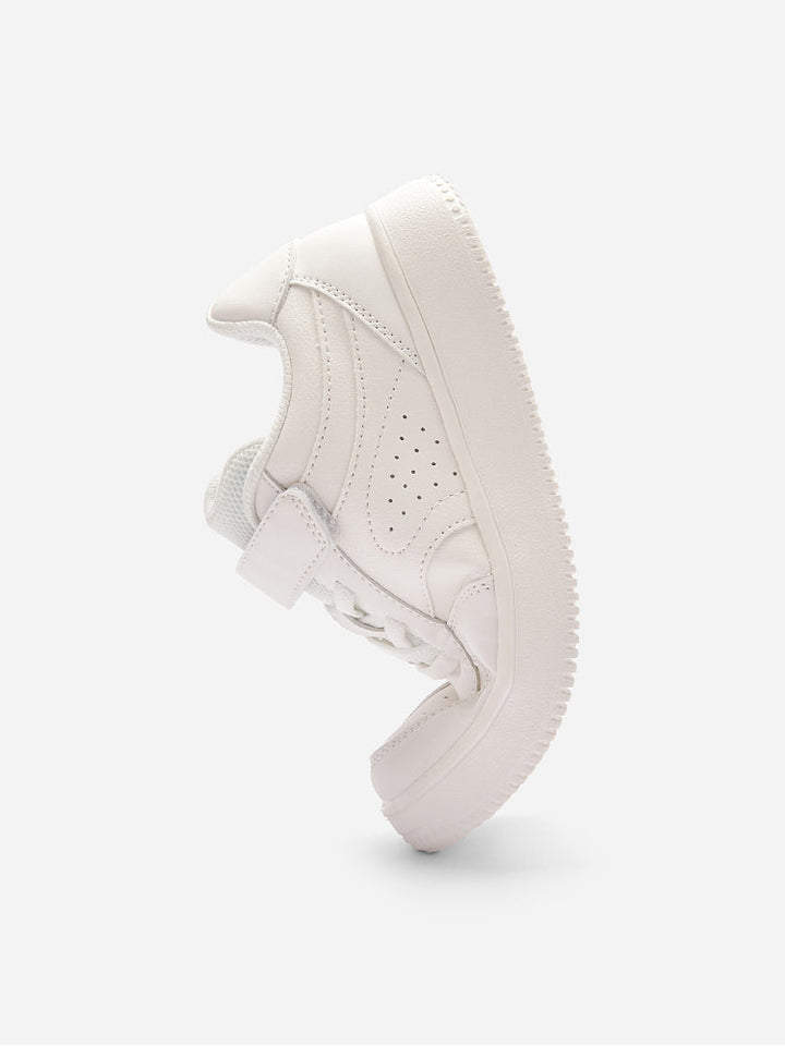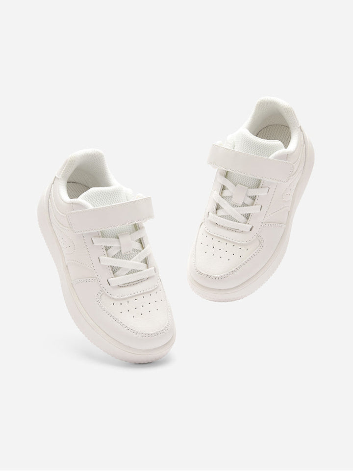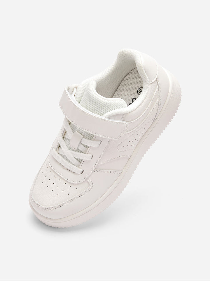 حذاء رياضي كلاسيكي باللون الأبيض مزود بفتحات تهوية ونعل مبطن مريح. يتميز بسير لاصق مع أربطة مطاطية لسهولة الارتداء وثبات أفضل، مثالي للمدرسة، اللعب، والإطلالات اليومية.