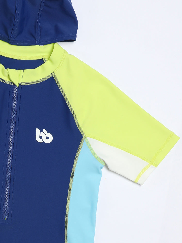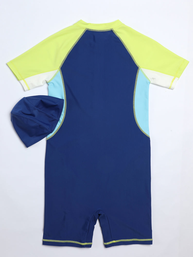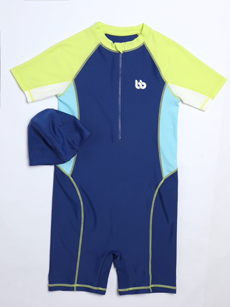 بدلة سباحة عملية للأطفال بقطعة واحدة، مزودة بسحّاب أمامي لسهولة الارتداء، وأكمام قصيرة مع قبعة سباحة مطابقة. تمنح الراحة والمرونة أثناء السباحة واللعب في الماء.