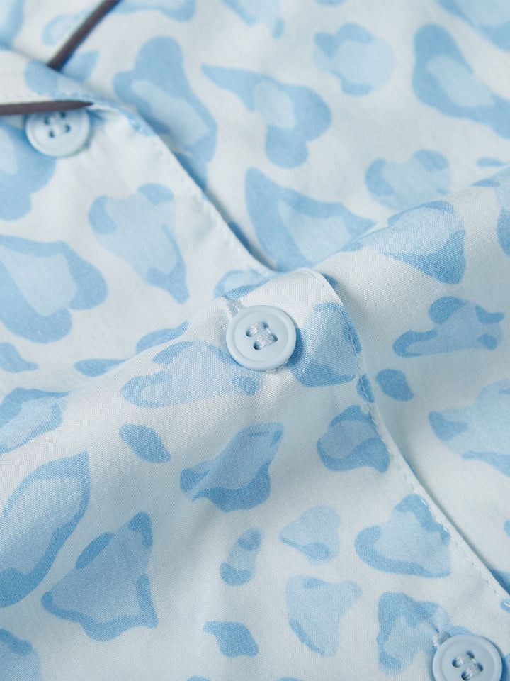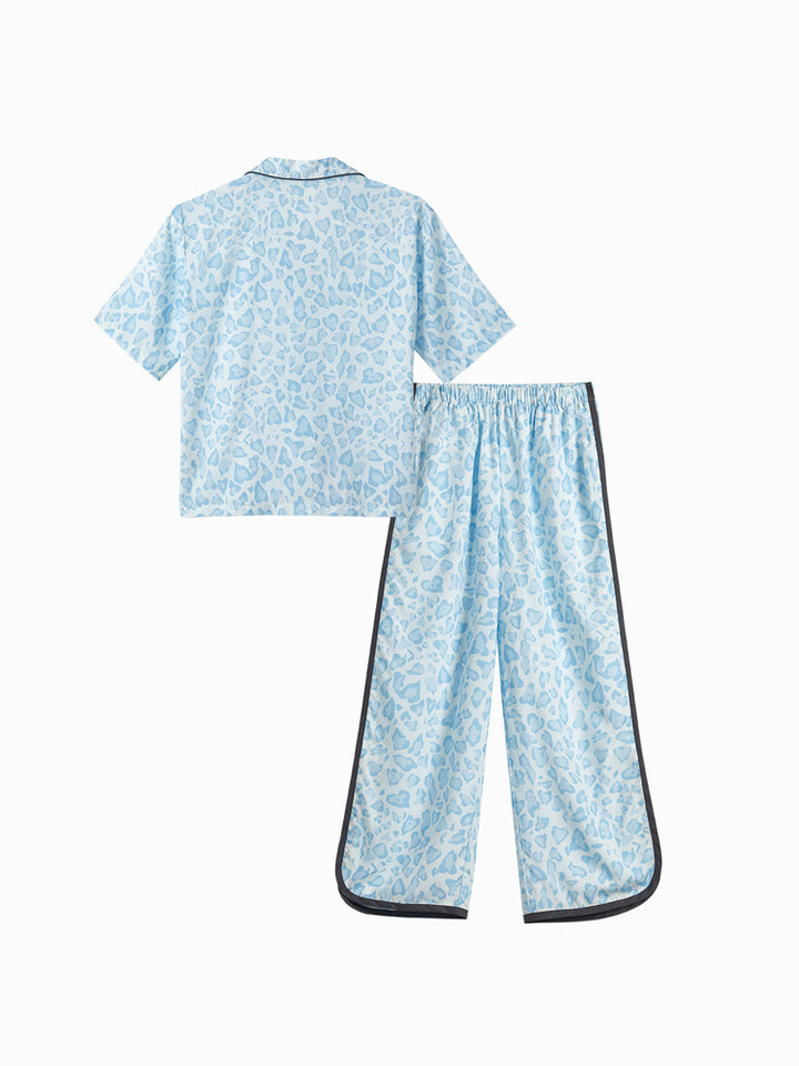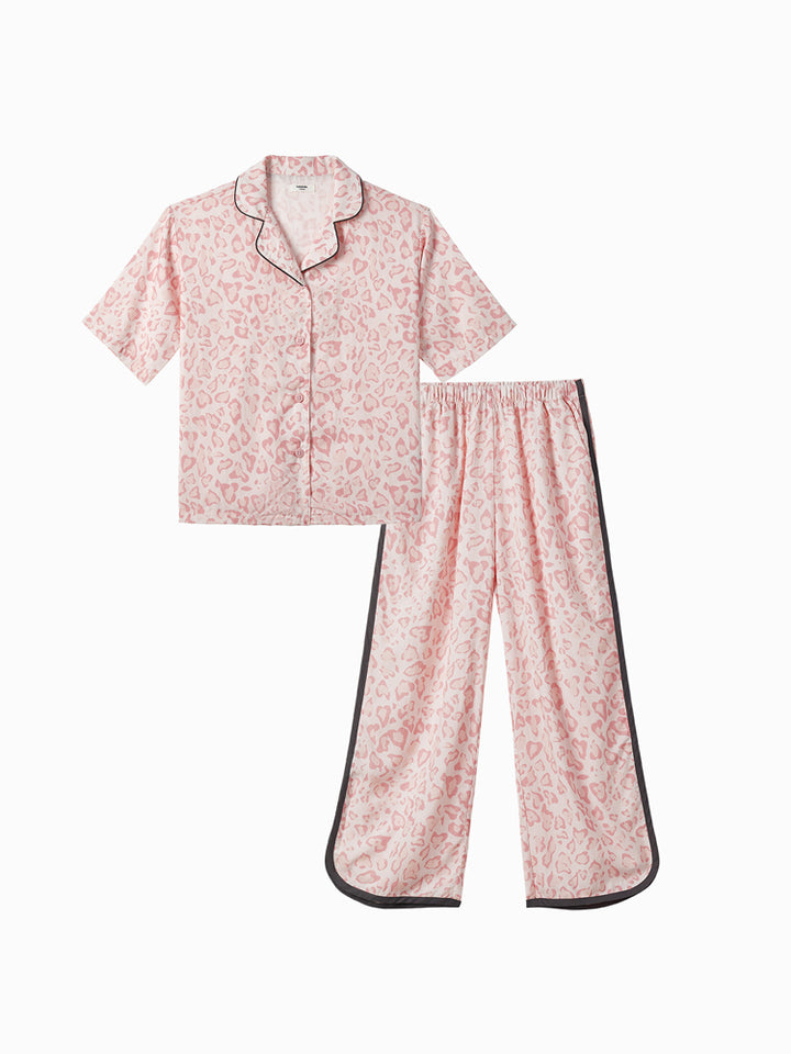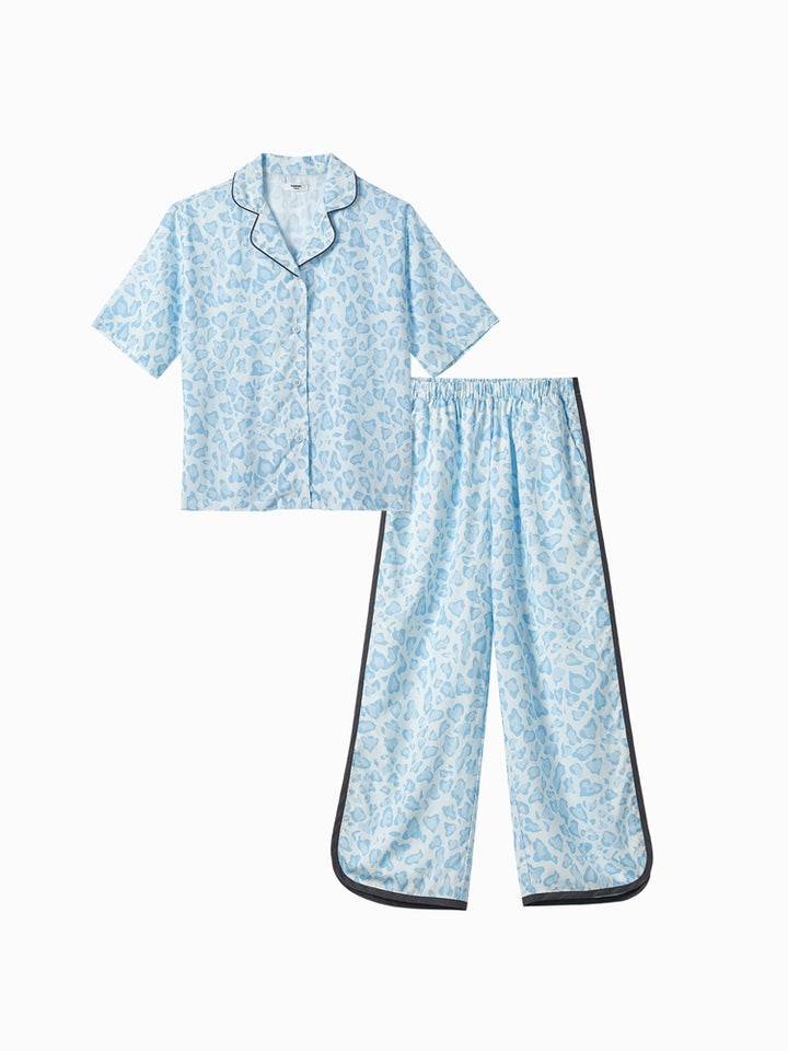 طقم بيجامة مكون من قطعتين، قميص بأكمام قصيرة، مزين بنمط طبعات، يأتي بأزرار للإغلاق من الجهة الأمامية وبياقة كلاسيكية عادية، وبنطلون فضفاض بقصة واسعة، مزين بنمط طبعات وتفاصيل خطوط على جانب الساقين، يأتي بجيوب من الجهة الأمامية وبخصر مطاطي مرن ومريح