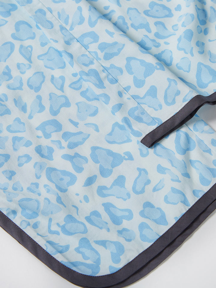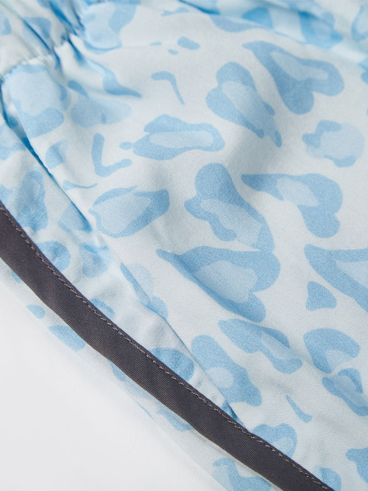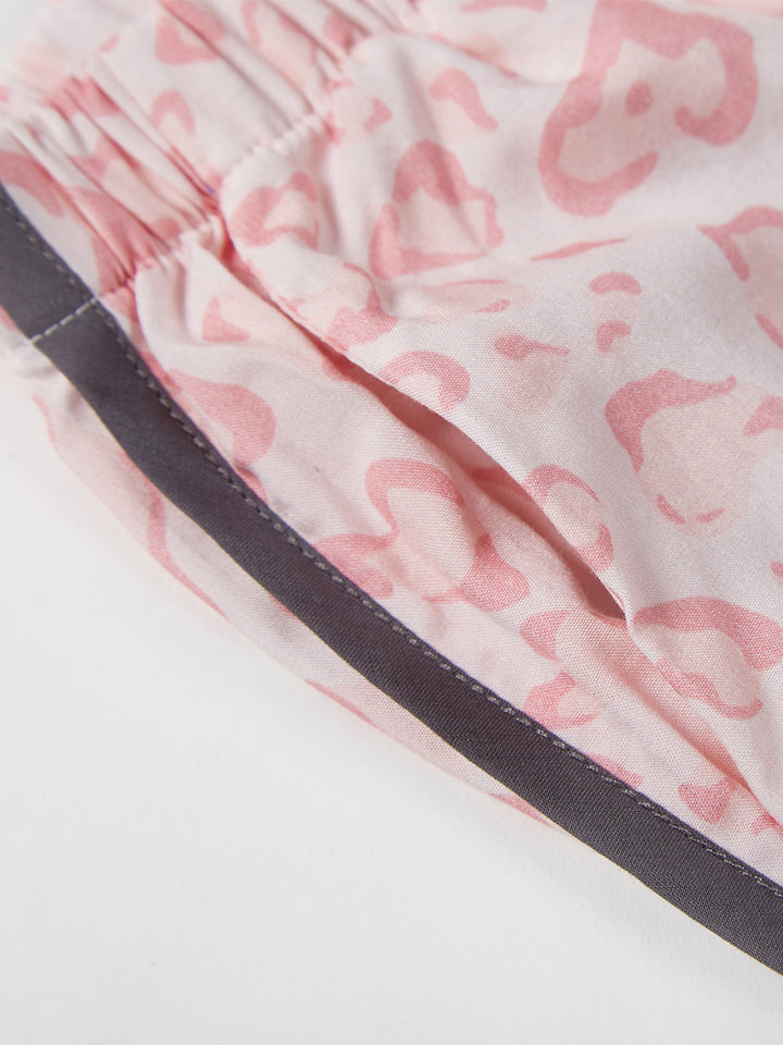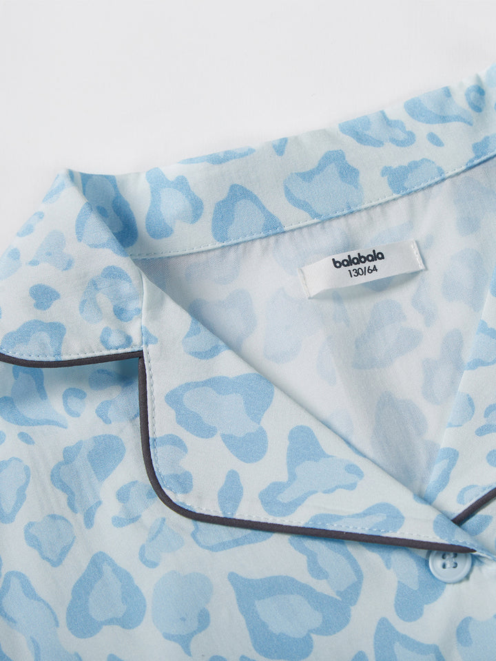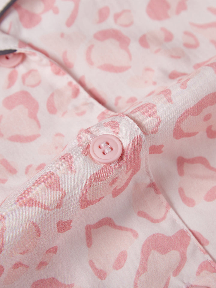 طقم بيجامة مكون من قطعتين، قميص بأكمام قصيرة، مزين بنمط طبعات، يأتي بأزرار للإغلاق من الجهة الأمامية وبياقة كلاسيكية عادية، وبنطلون فضفاض بقصة واسعة، مزين بنمط طبعات وتفاصيل خطوط على جانب الساقين، يأتي بجيوب من الجهة الأمامية وبخصر مطاطي مرن ومريح