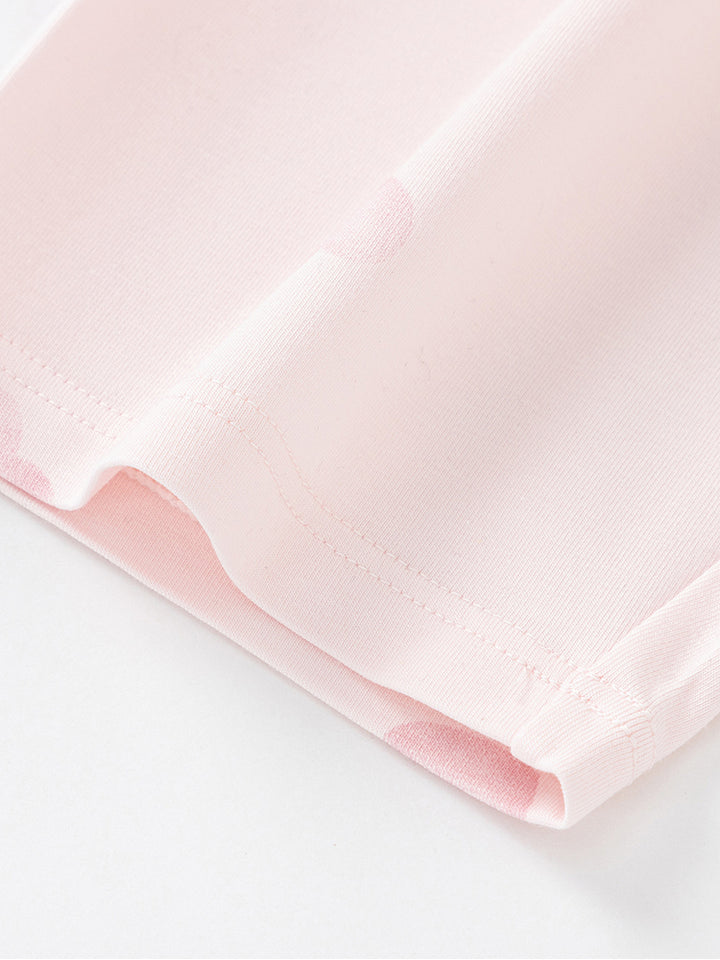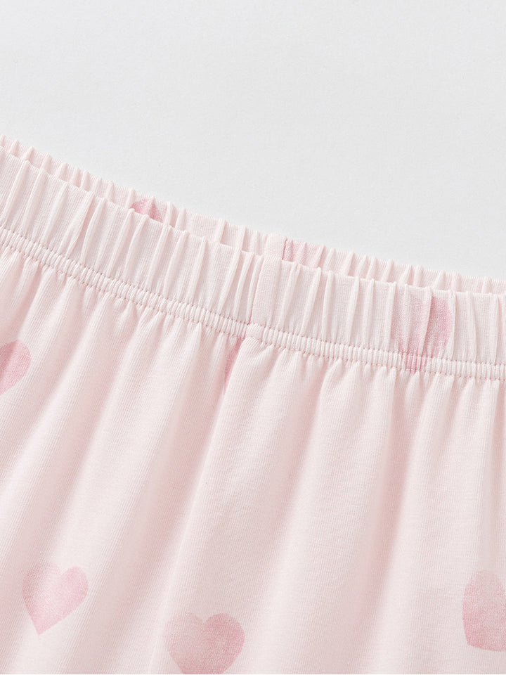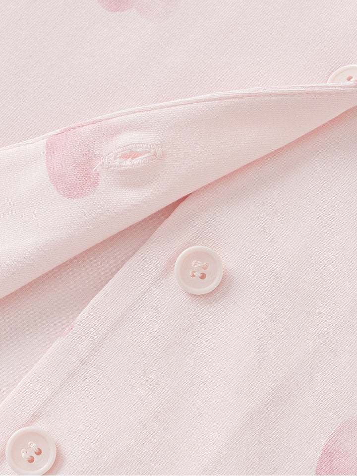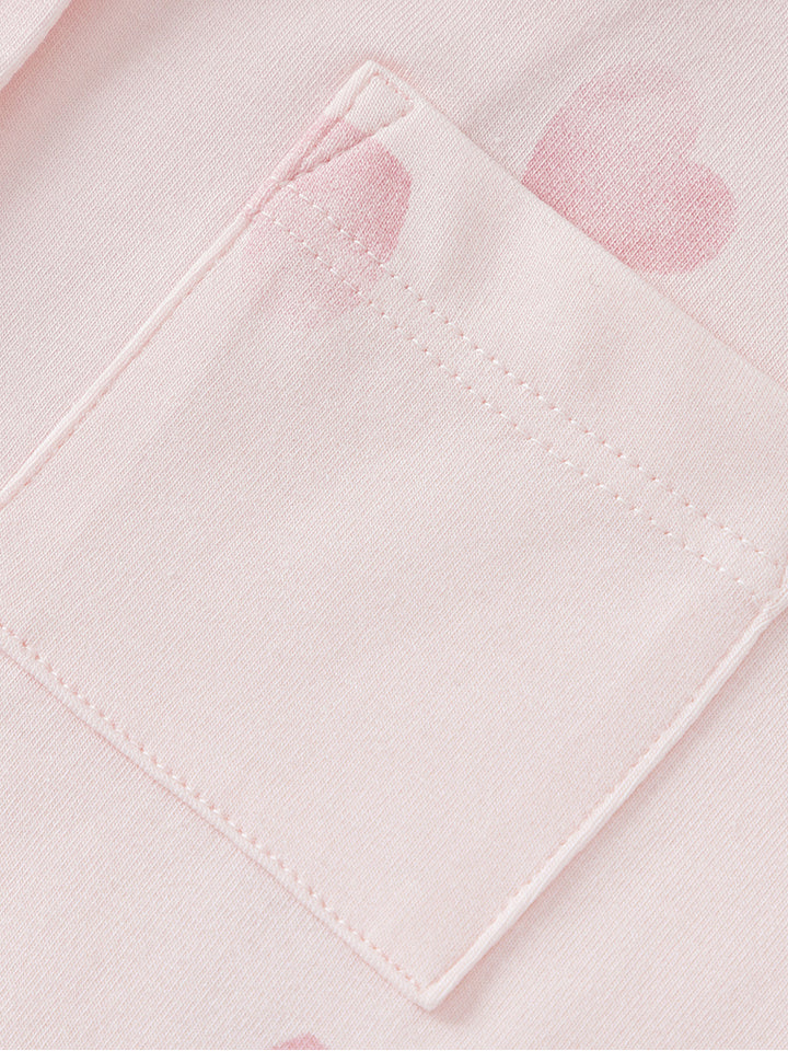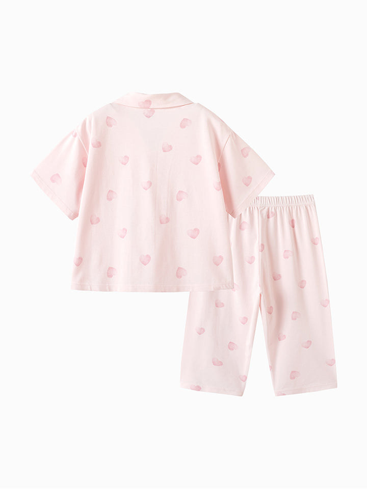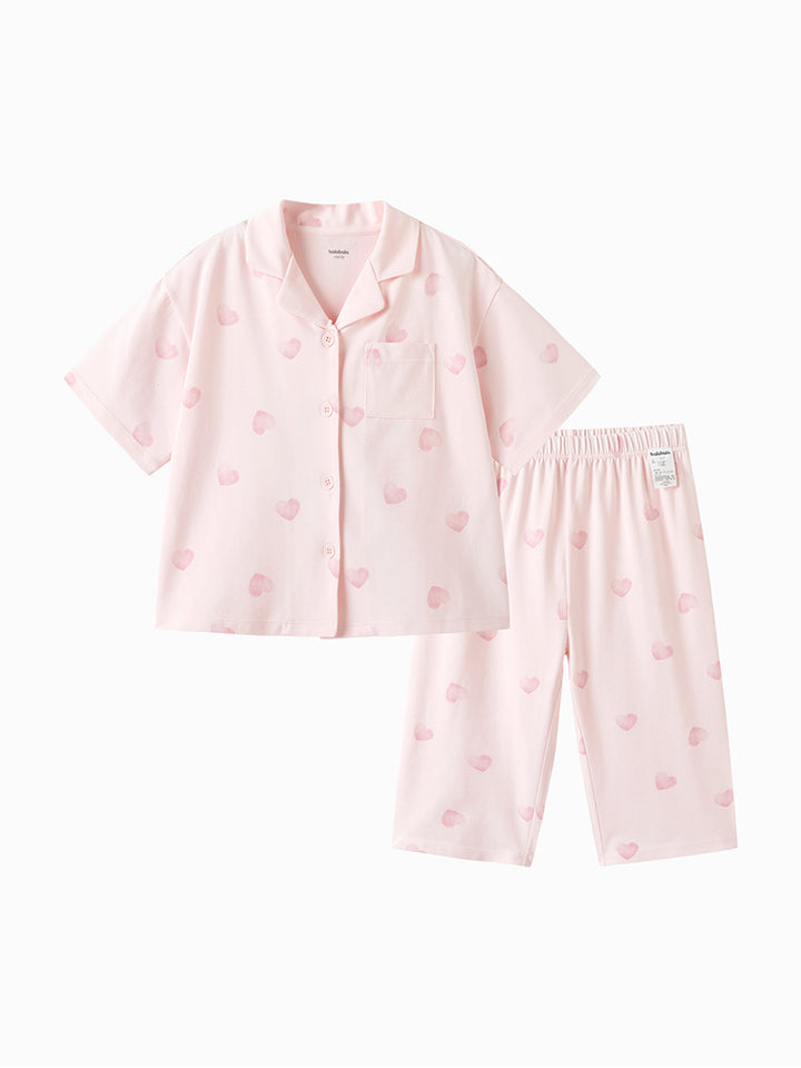 طقم بيجامة بناتي مكون من قطعتين، قميص بأكمام قصيرة، مزين بنمط طبعات على كامل التصميم، يأتي بجيب من الجهة الأمامية، أزرار للإغلاق من الجهة الأمامية وبياقة كلاسيكية عادية، وبنطلون فضفاض بقصة واسعة، مزين بنمط طبعات على كامل التصميم، يأتي بخصر مطاطي مرن ومريح