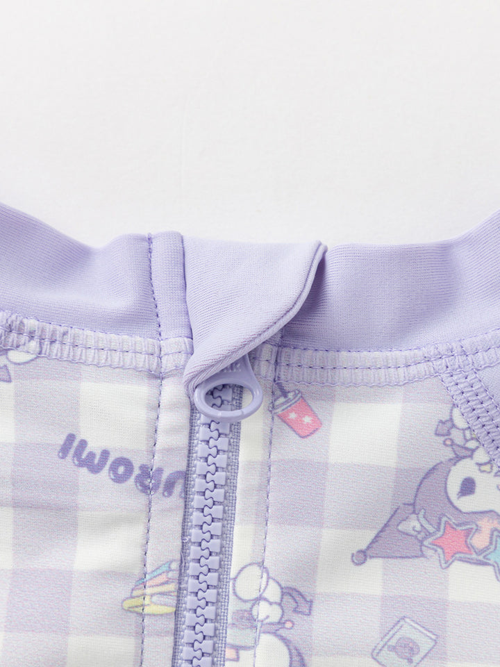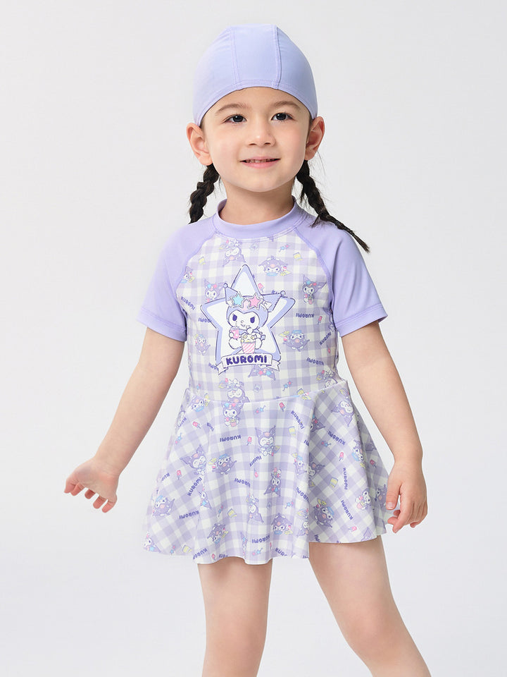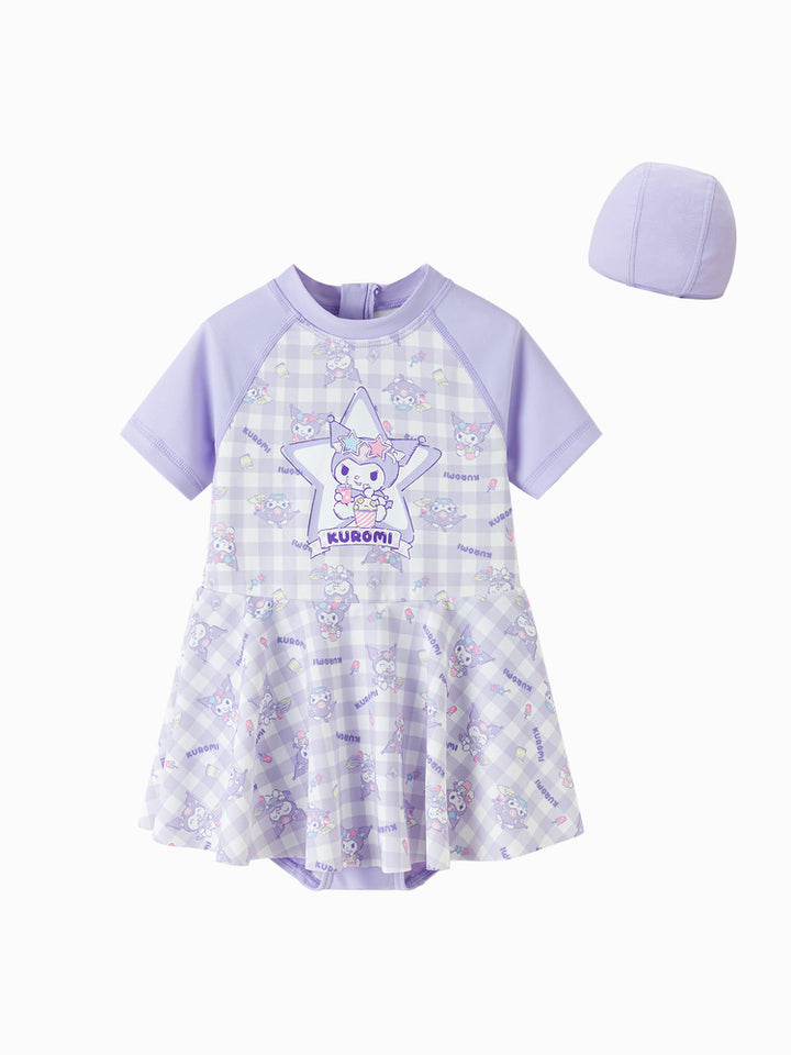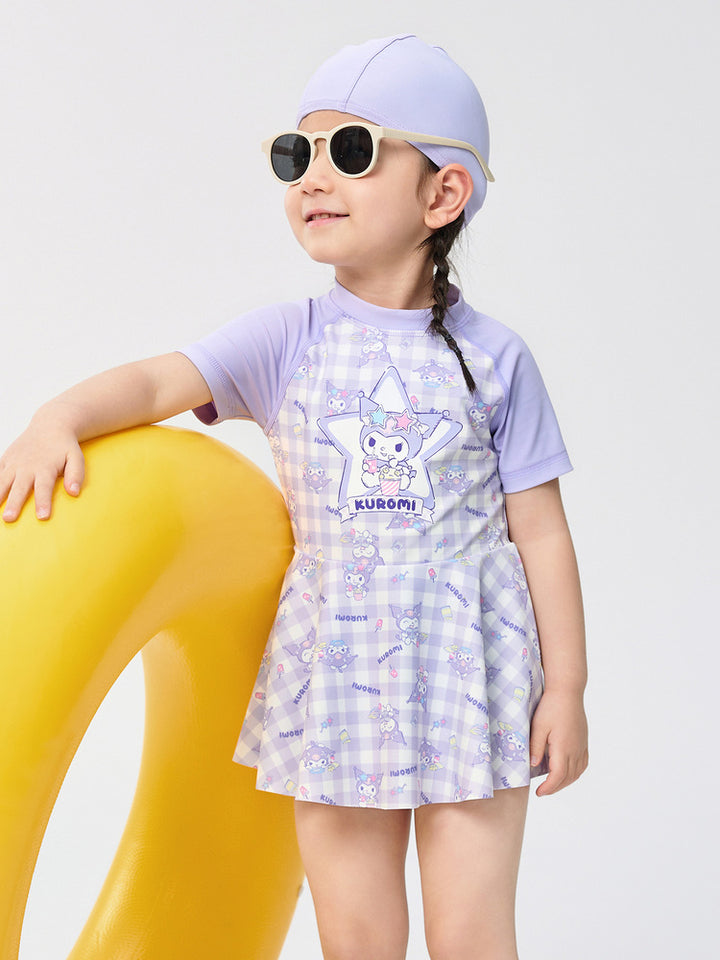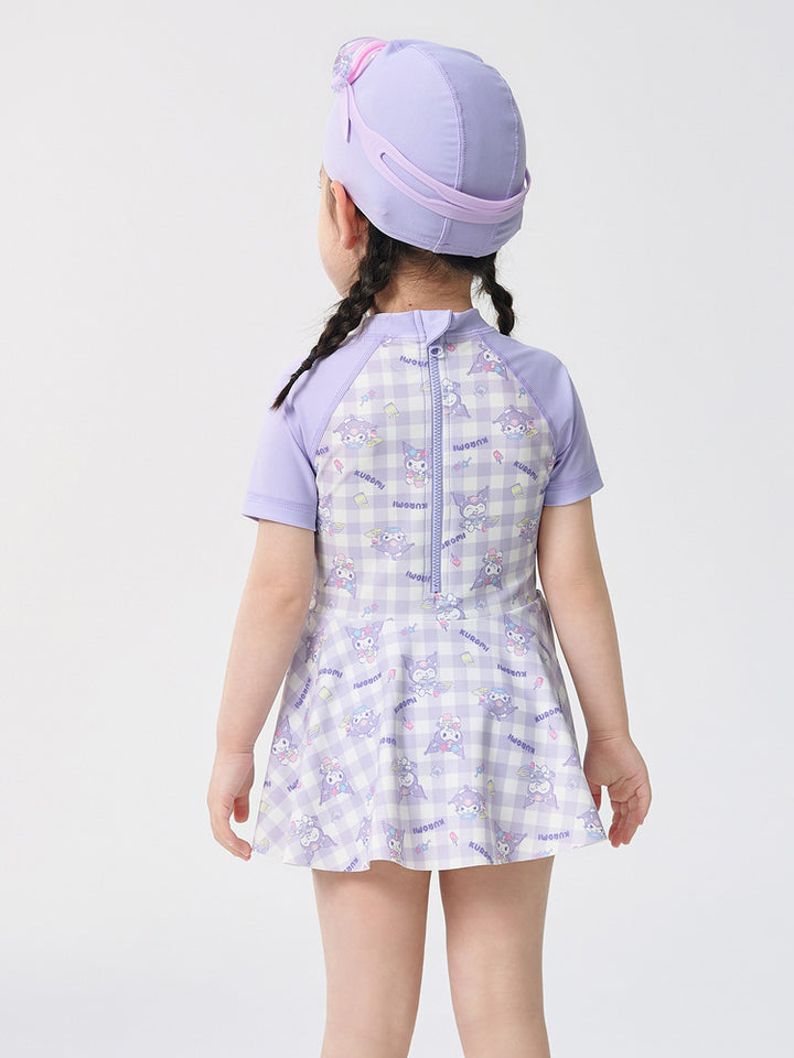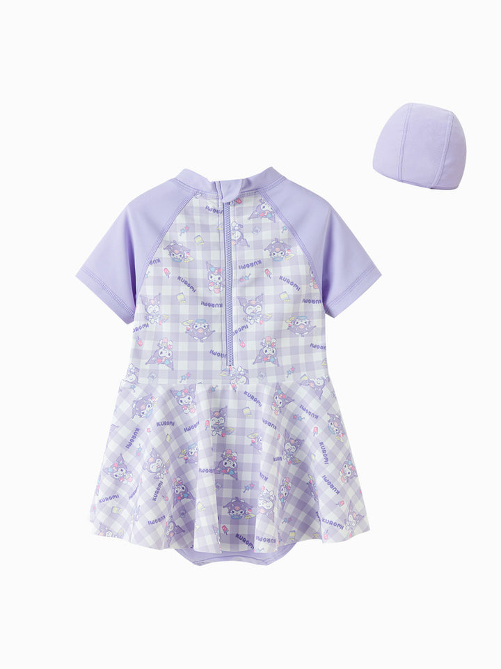بدلة سباحة للأطفال بتصميم كامل من الطبعات، مع سحاب خلفي للإغلاق وياقة مدورة. تأتي مع قبعة سباحة مطابقة لإطلالة متكاملة.