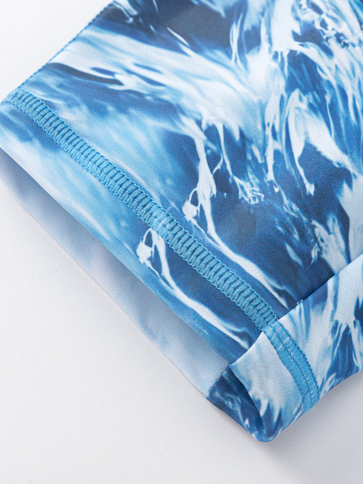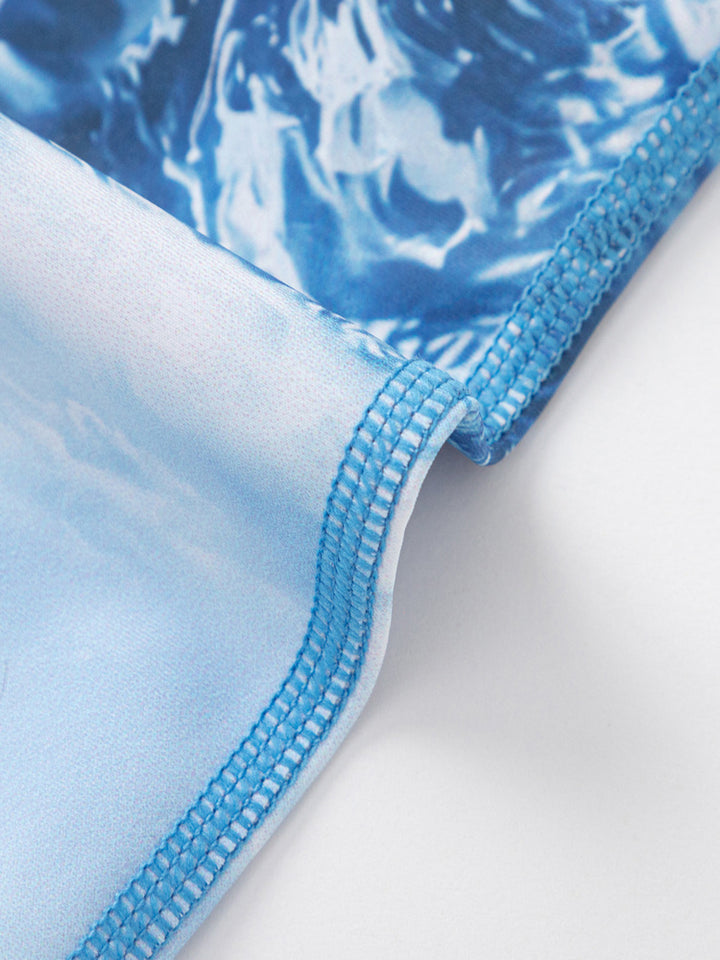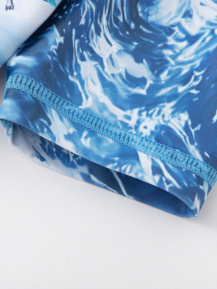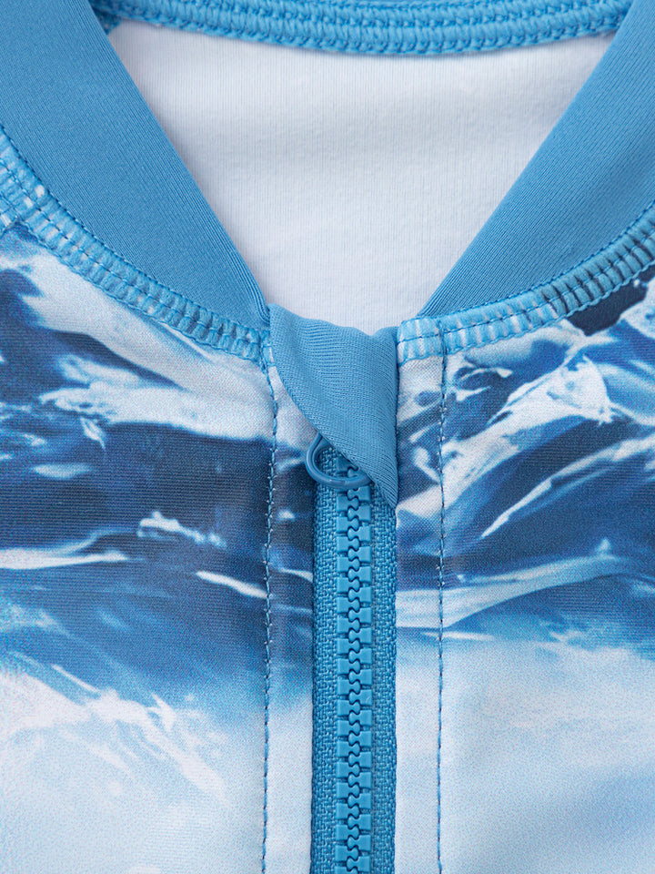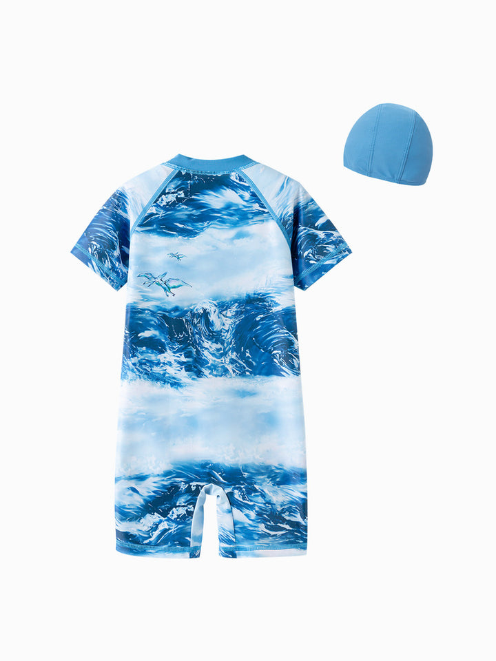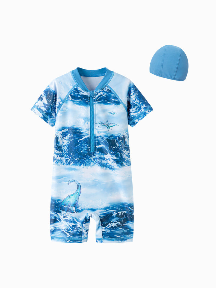 بدلة سباحة للأطفال بأكمام قصيرة مع طباعة مميزة، سحاب أمامي للإغلاق وياقة مدورة. تأتي مع قبعة سباحة مطابقة لإطلالة متكاملة.