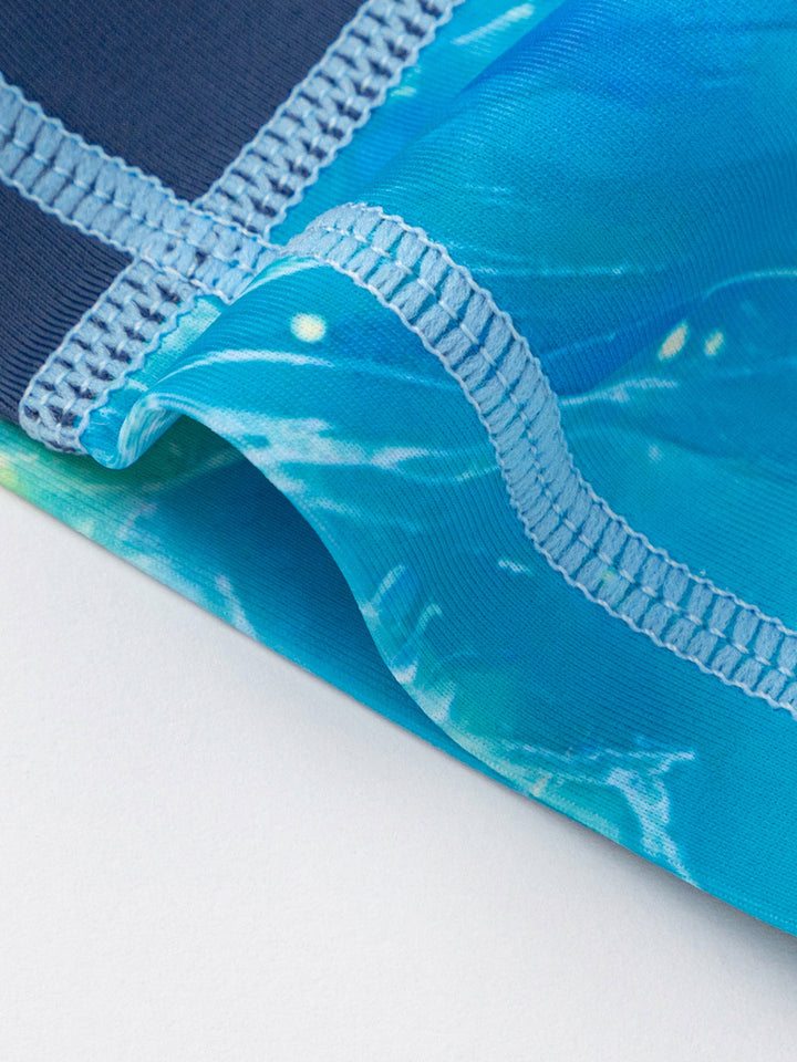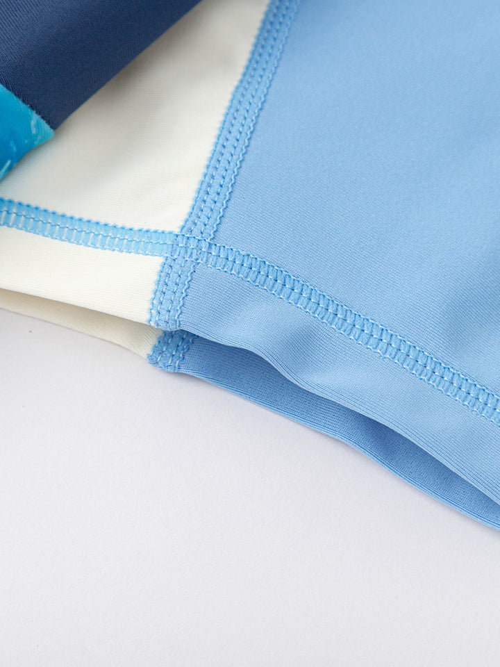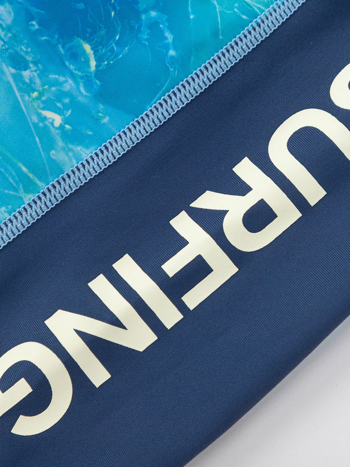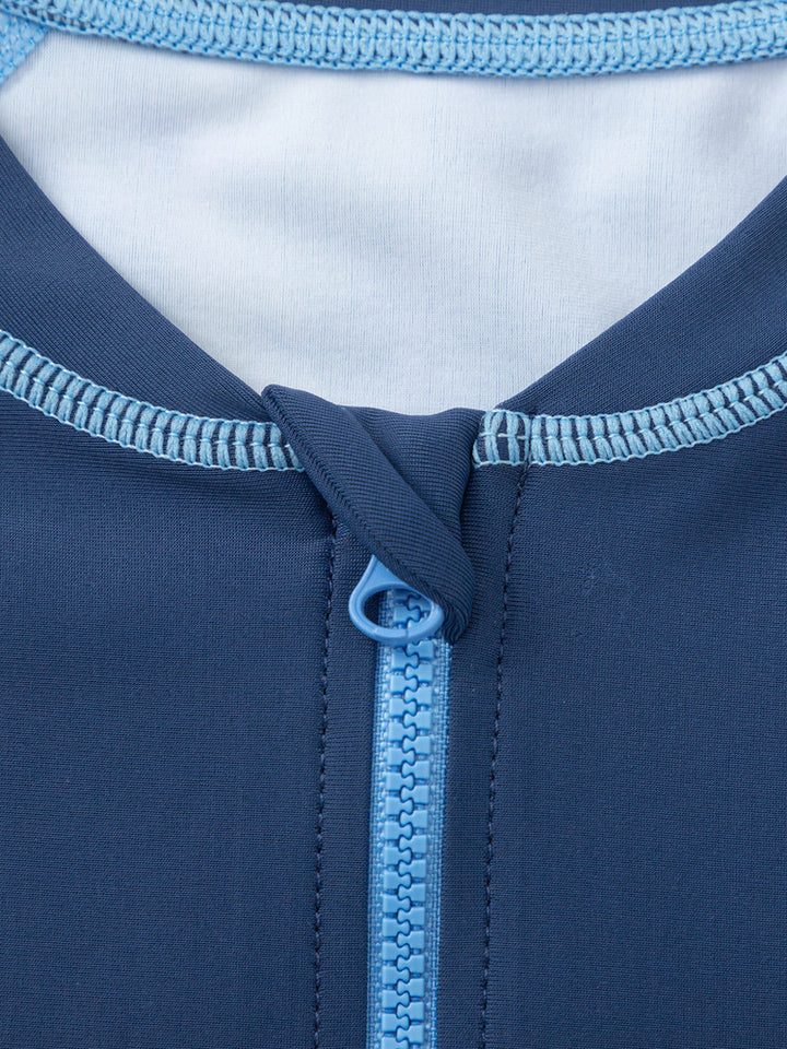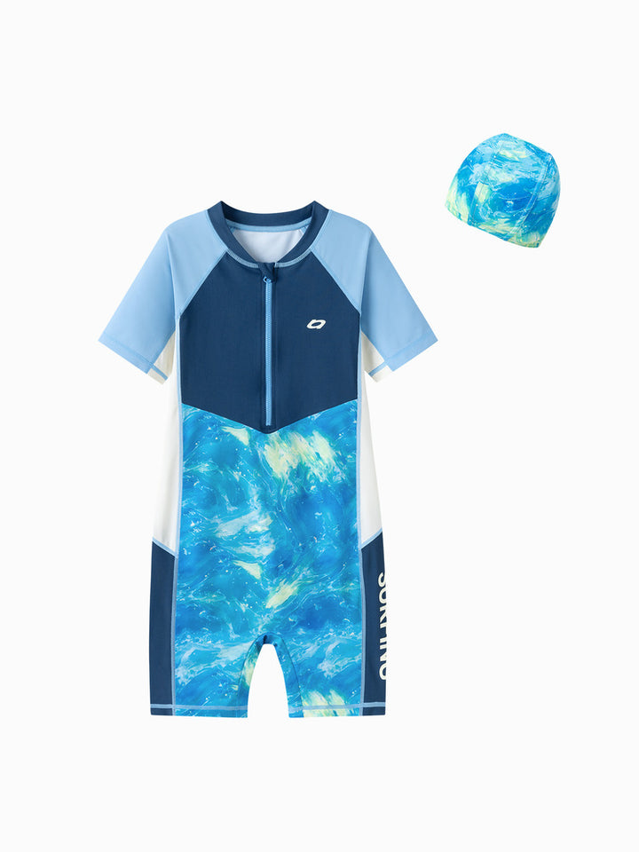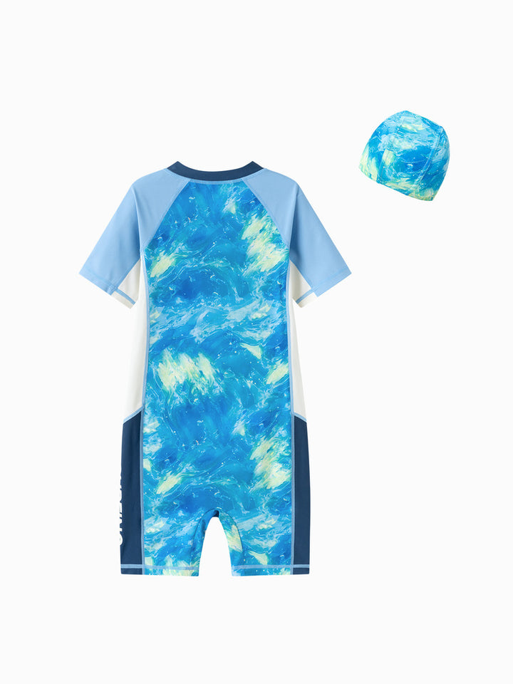 بدلة سباحة للأطفال بأكمام قصيرة مع طباعة مميزة، سحاب أمامي للإغلاق وياقة مدورة. تأتي مع قبعة سباحة مطابقة لإطلالة متكاملة.