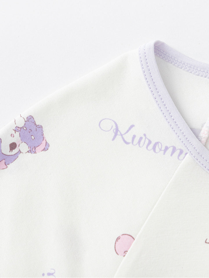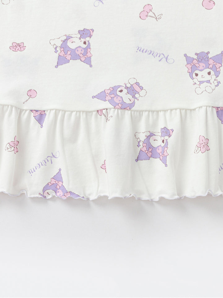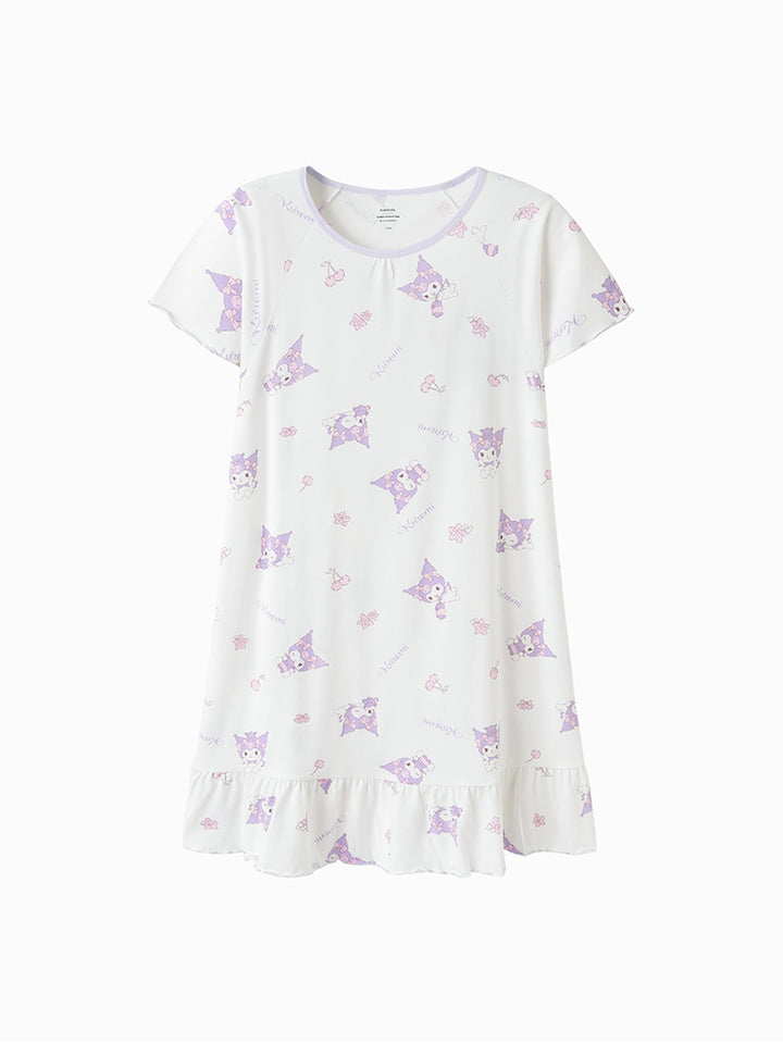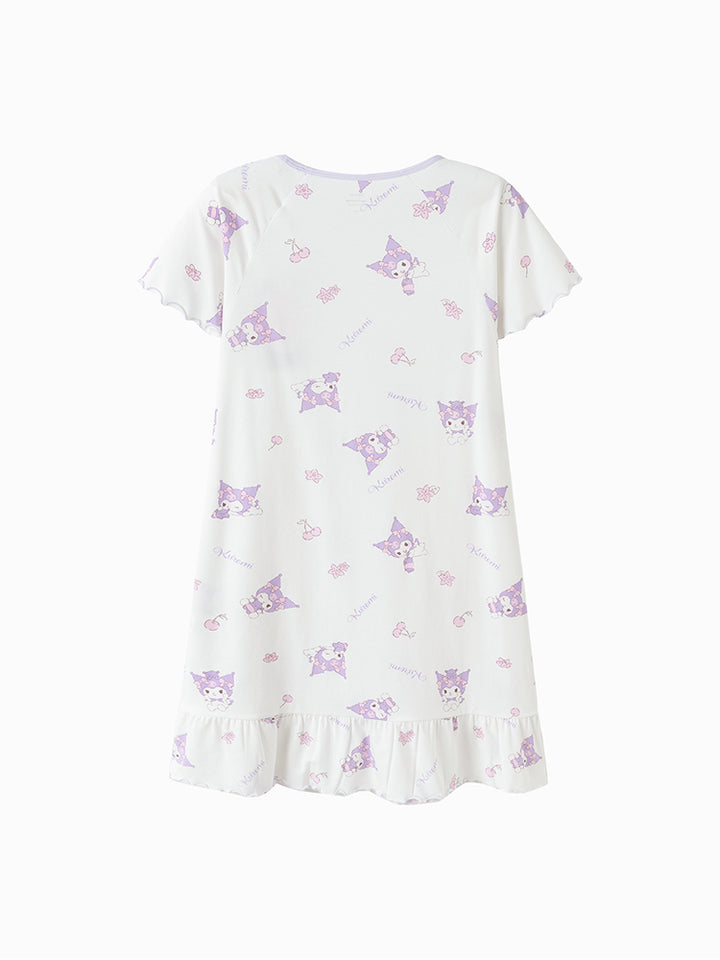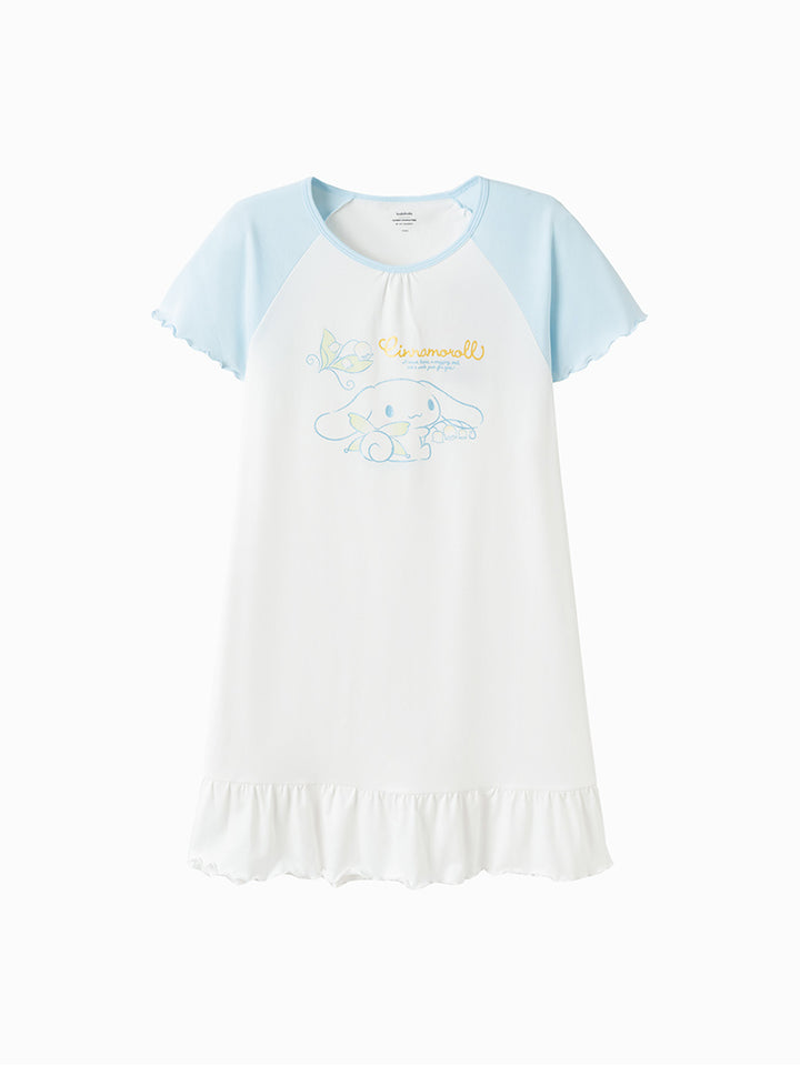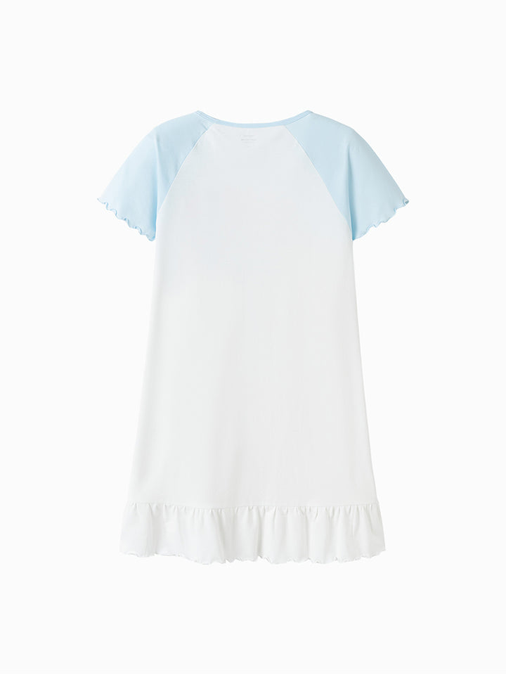 فستان للبيت بأكمام قصيرة، مزين بأكمام متباينة اللون وطبعة من الجهة الأمامية، ياتي بياقة مدورة الشكل