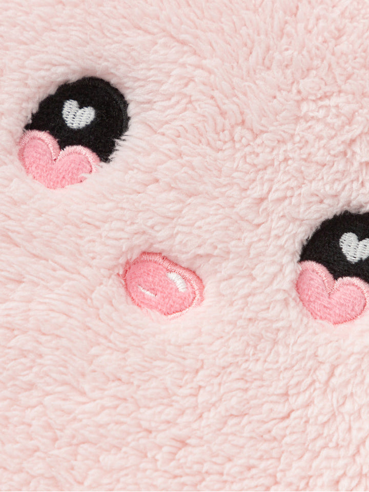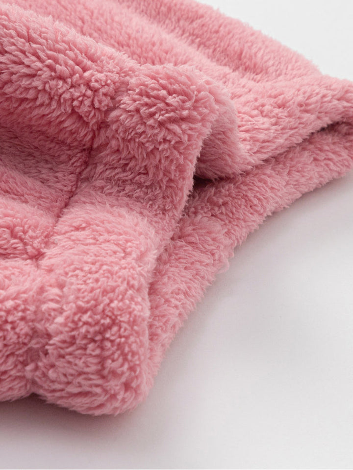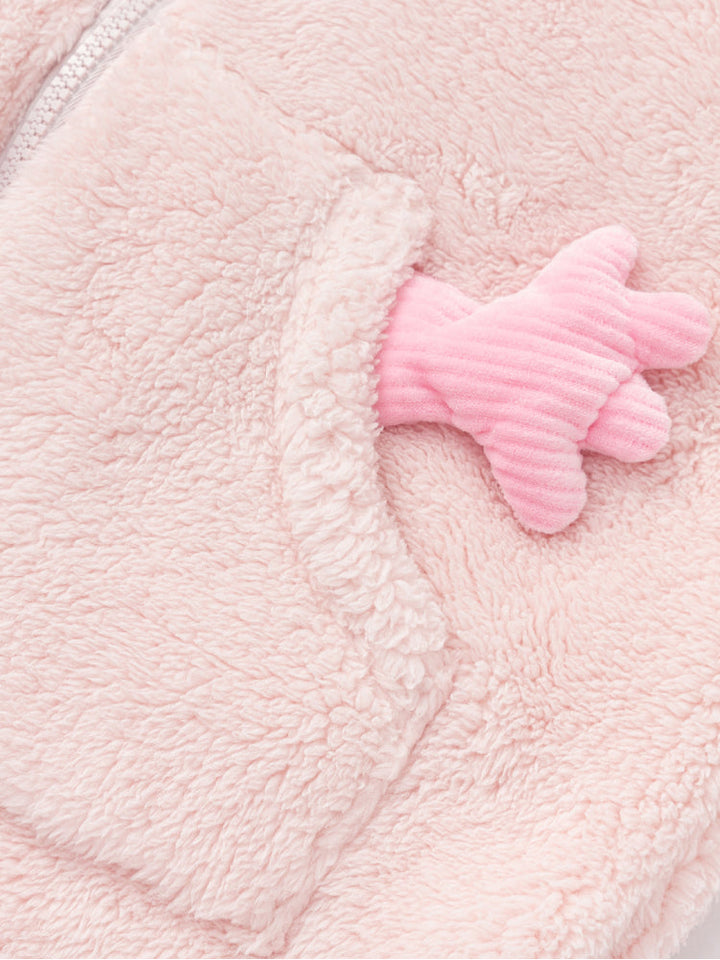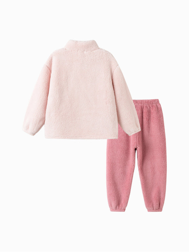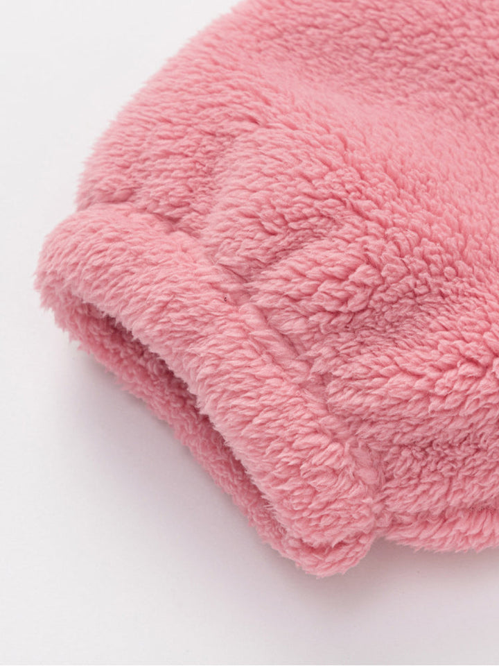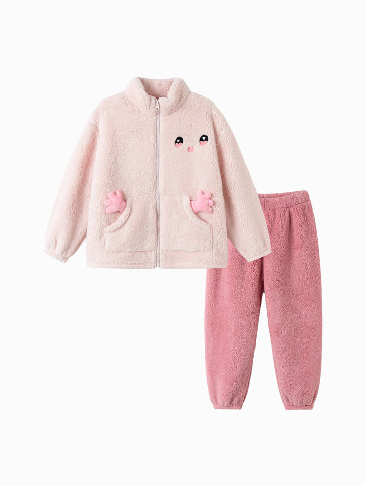 طقم فرو دافئ ومريح للأطفال، يتكون من جاكيت بسحاب مزين بوجه مطرز وجيوب على شكل كفوف مرحة، مع بنطلون متناسق. ناعم ومريح، مثالي للأيام الباردة.