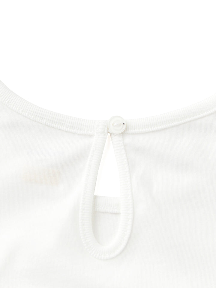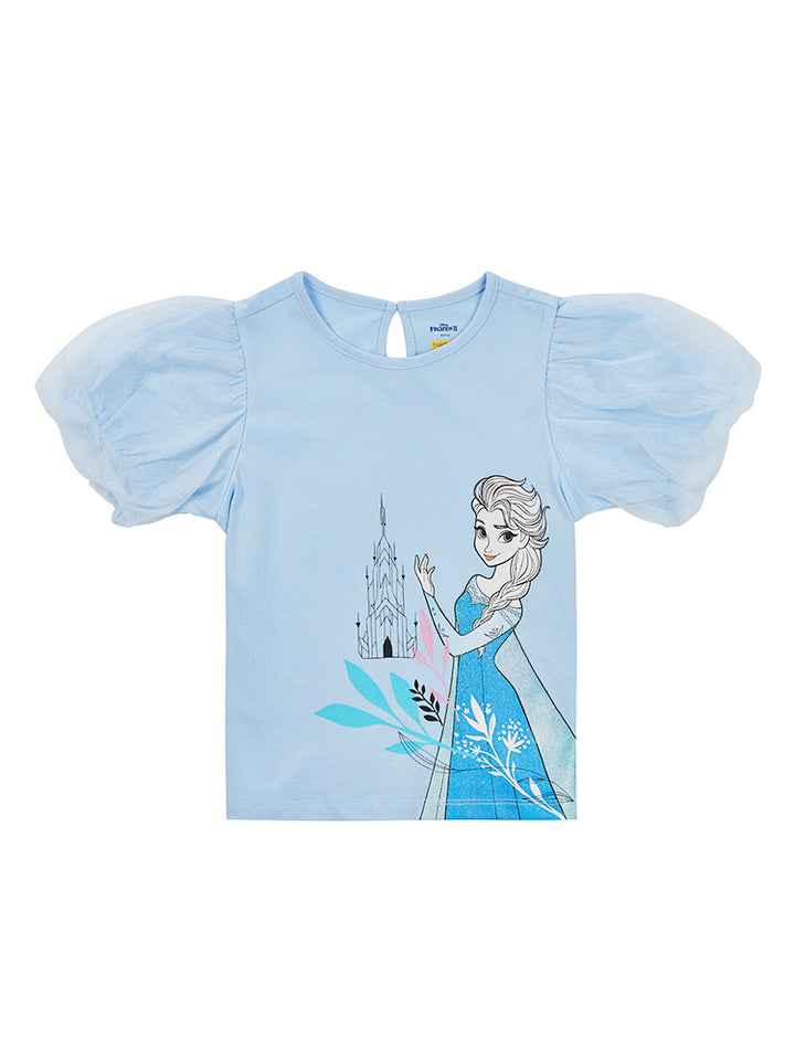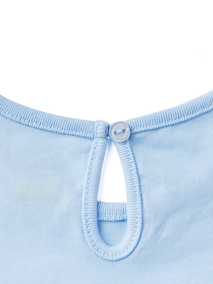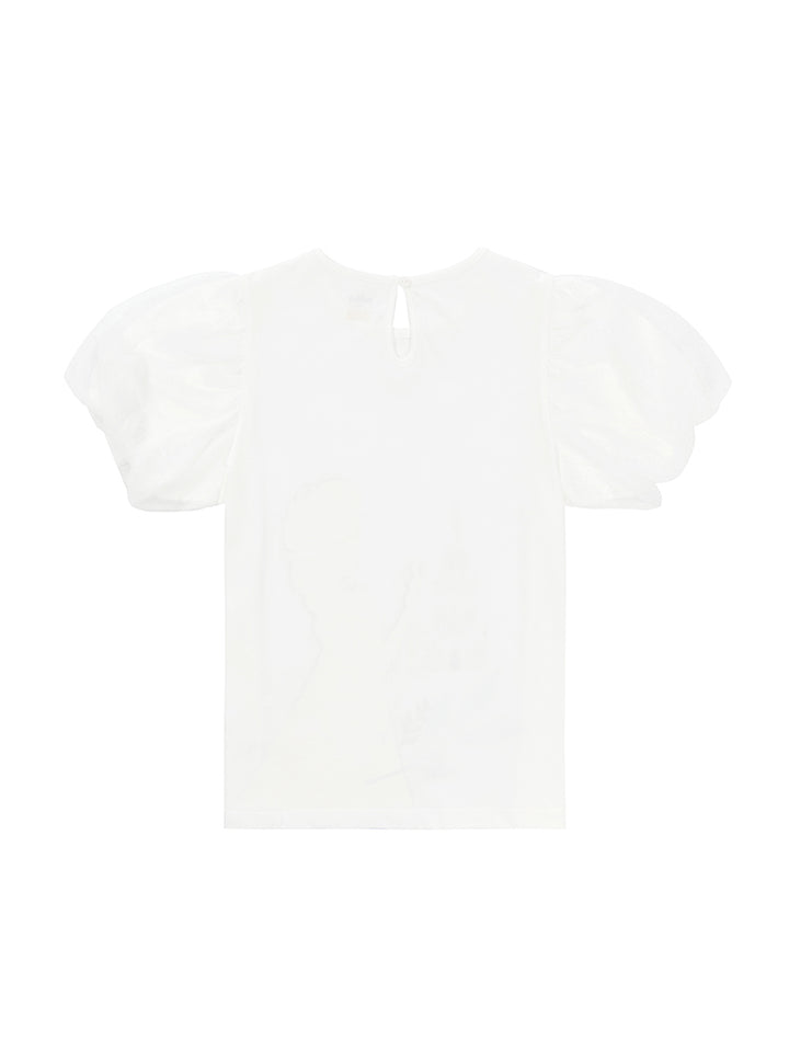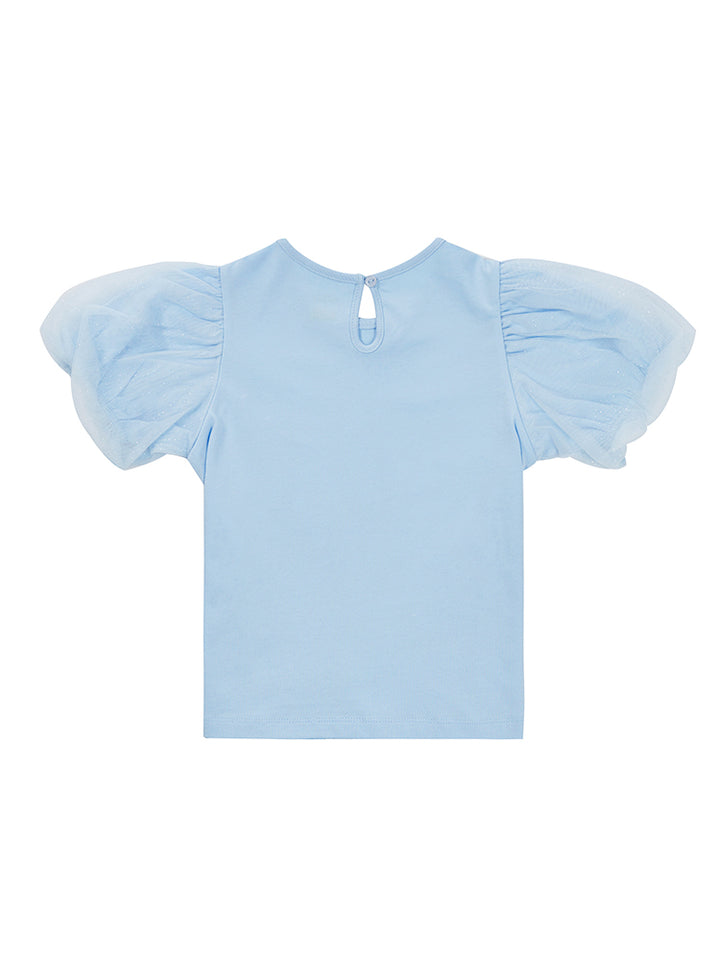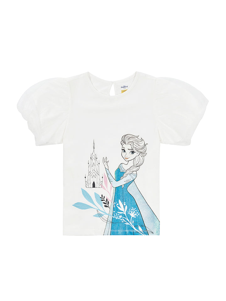 تيشيرت بأكمام قصيرة، مزينة بطبعة من الجهة الأمامية وبتفاصيل خامة تل طبقات على الأكمام، تأتي بزر للإغلاق من الجهة الخلفية وبقبة مدورة الشكل