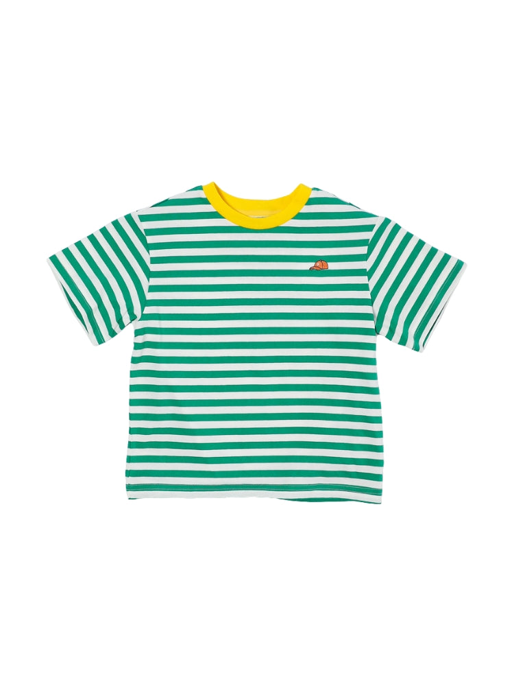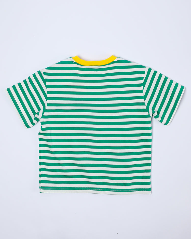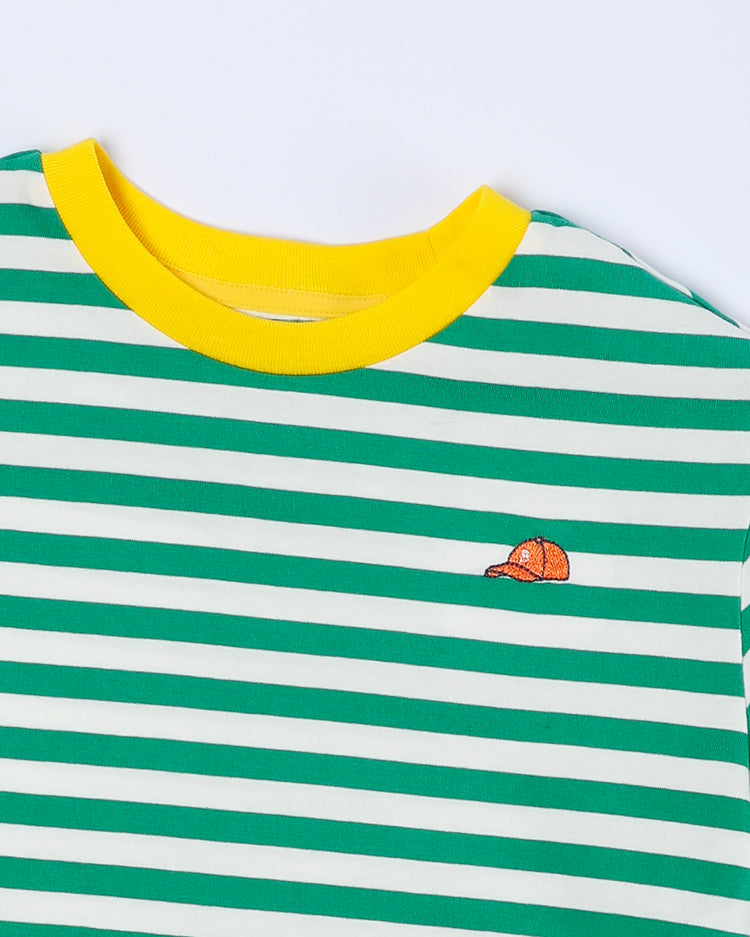 تيشيرت أطفال مخطط بتصميم كاجوال مع ياقة دائرية بلون متباين. مصنوع من قماش قطني مريح وعملي، مثالي للارتداء اليومي والإطلالة الحيوية.