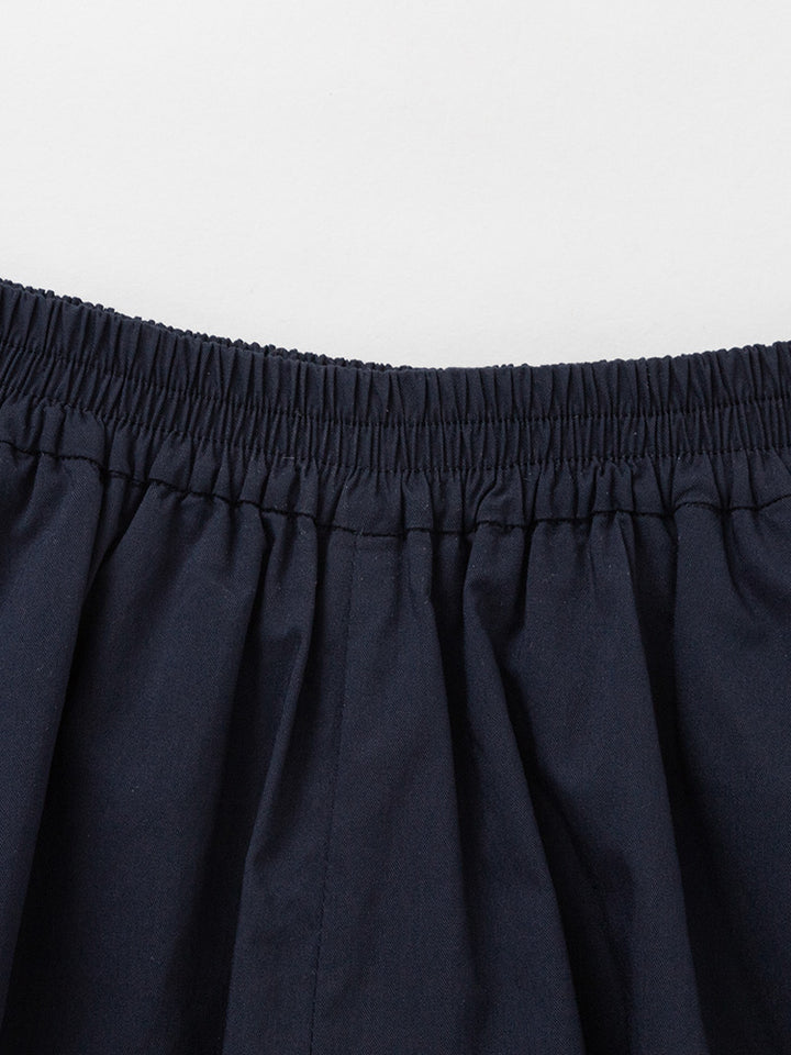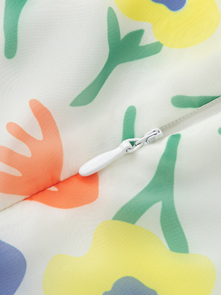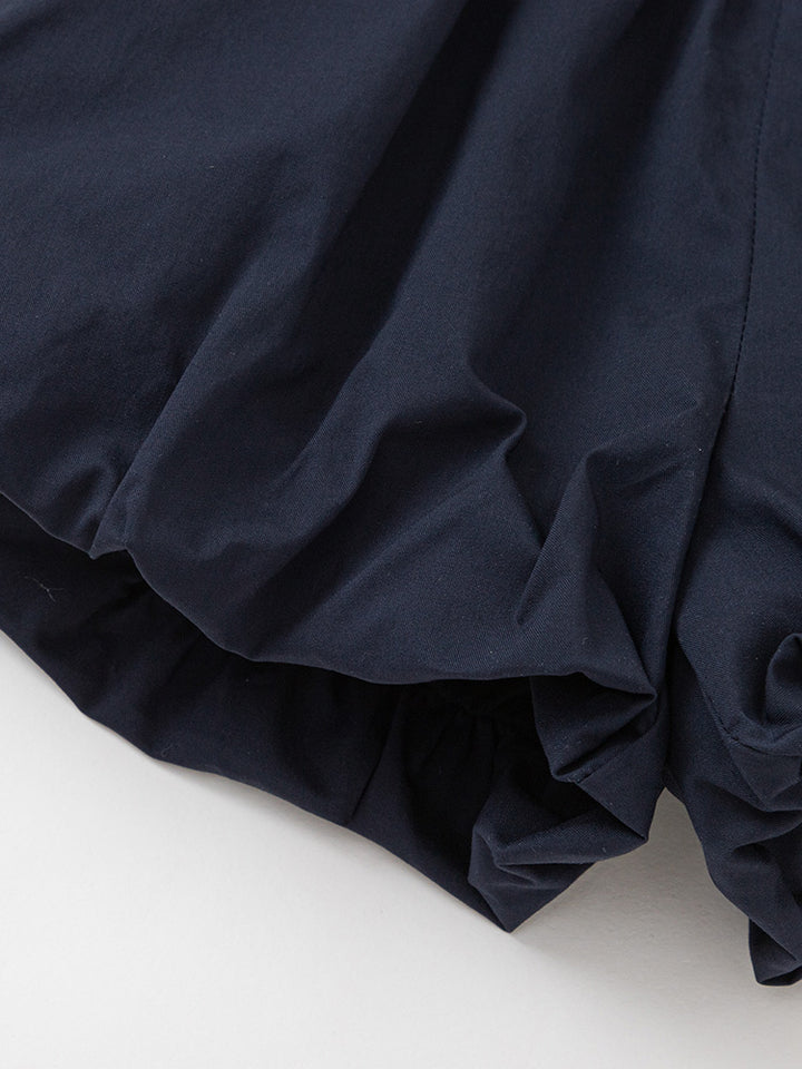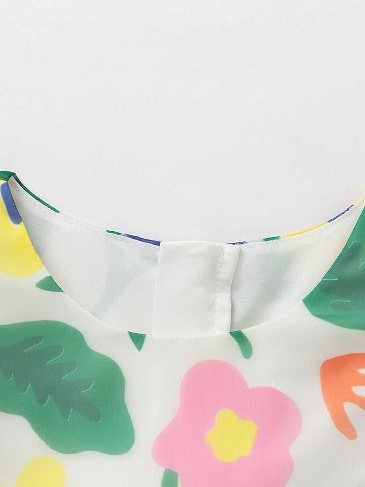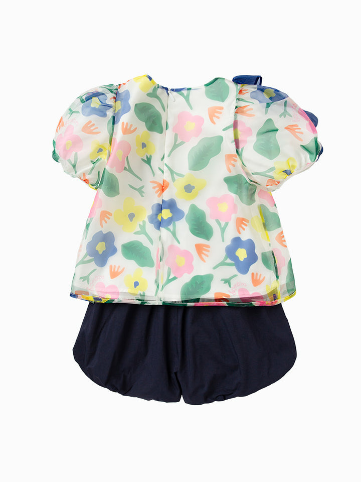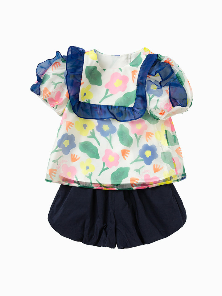 طقم بناتي مكون من قطعتين، بلوزة بأكمام قصيرة، مزينة بنمط طبعات ملون على كامل التصميم، كشكش من الجهة الأمامية وياقة مريلة عريضة منسدلة، تأتي بسحاب للإغلاق من الجهة الخلفية وبياقة مدورة الشكل، وشورت بتصميم بالون منفوخ ذو لون موحد سادة، يأتي بخصر مطاطي مرن ومريح