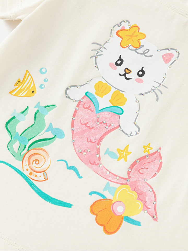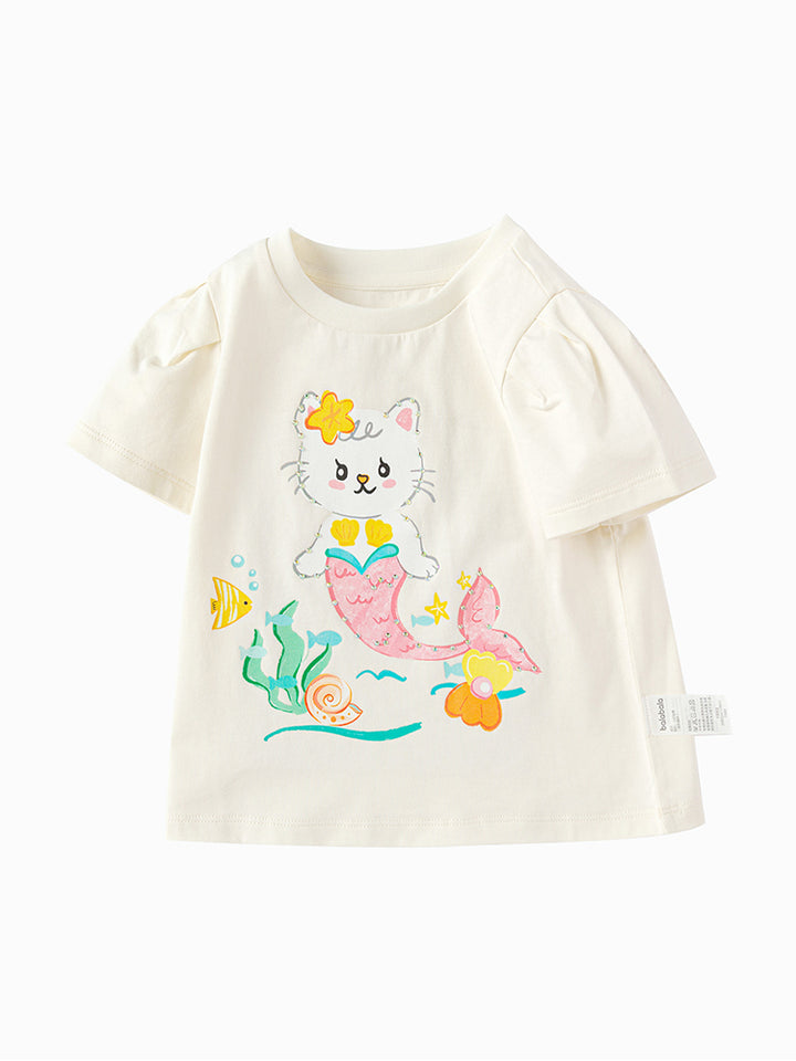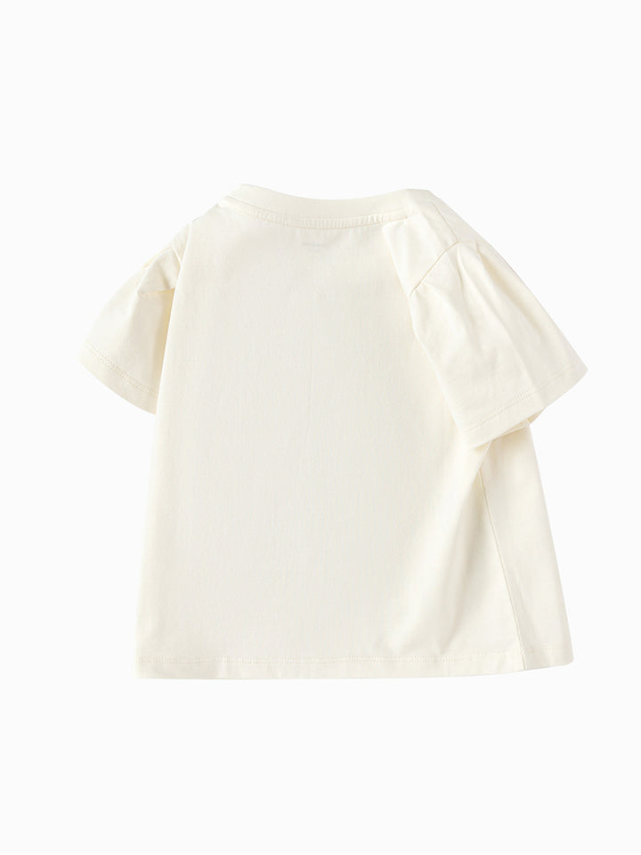 تيشيرت بناتي كاجوال بأكمام قصيرة، مزين بطبعة من الجهة الأمامية ويأتي بياقة مدورة الشكل